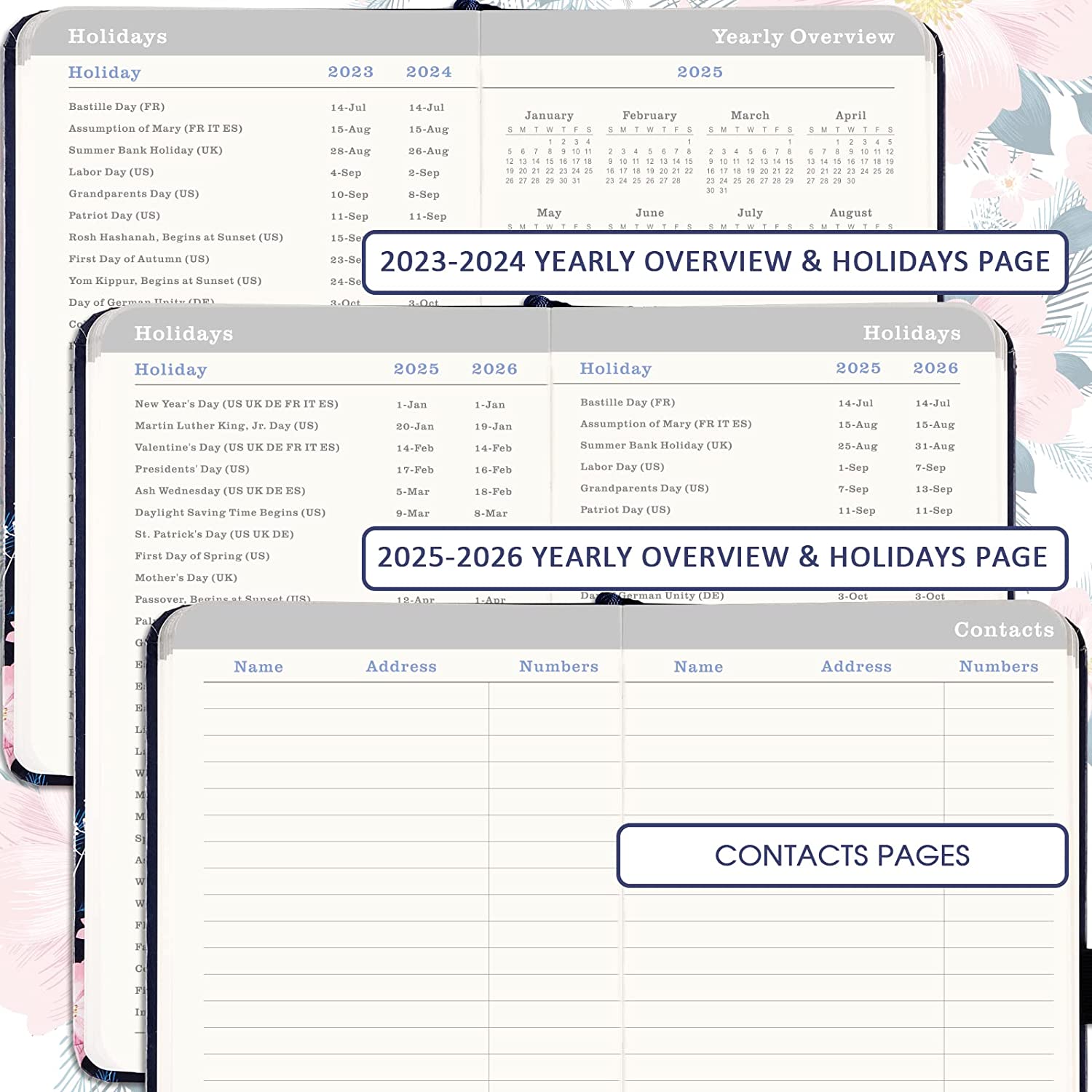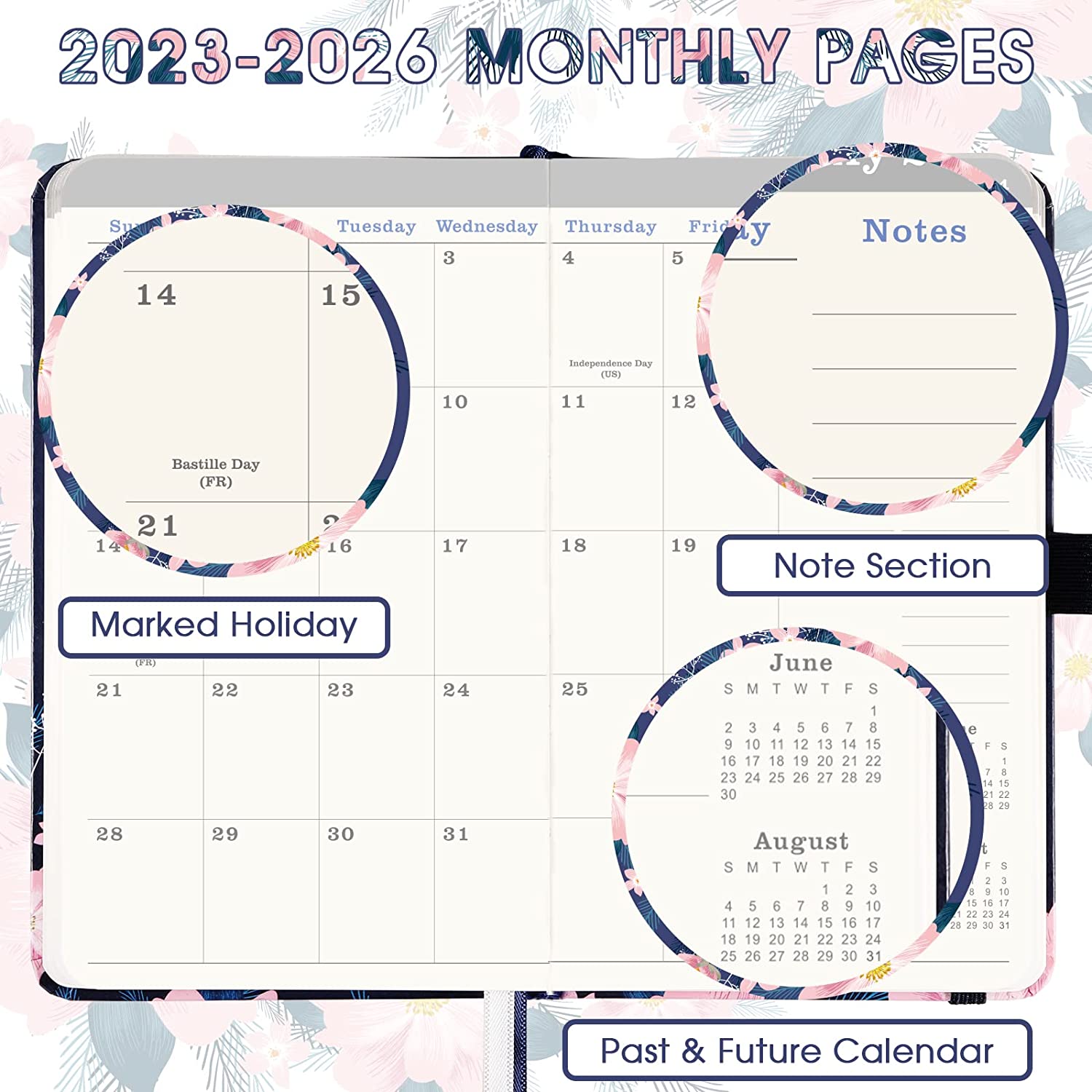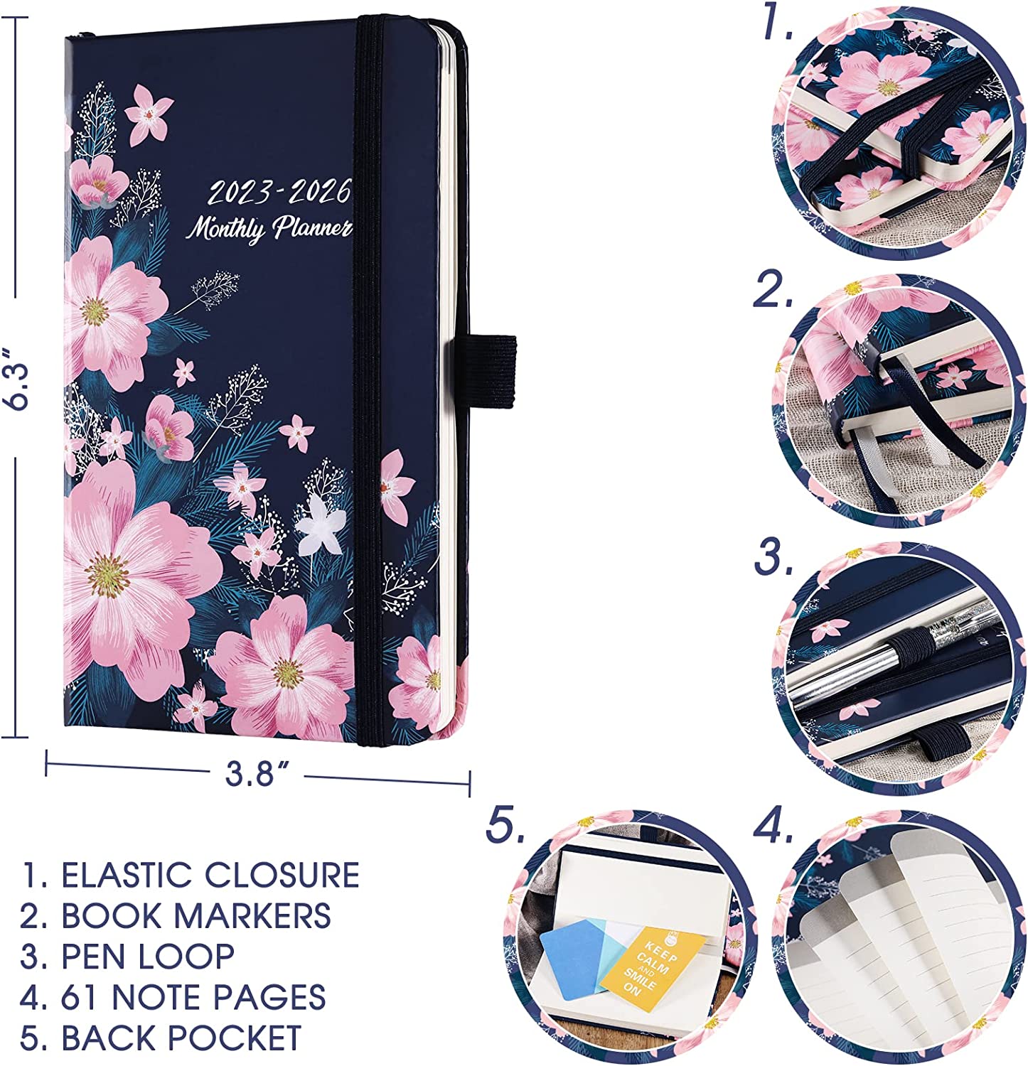 • ? Features - 2023-2026 Pocket Planner | 6.3" x 3.8" Pages | High-end Hardcover | Premium Thick Paper | 2 Book Markers | Inner pocket | Elastic Closure | Pen Loop | Round Corner | 2023-2026 Yearly Overview | 2023-2026 Holidays | 4 Contacts Pages | 61 Note Pages |.