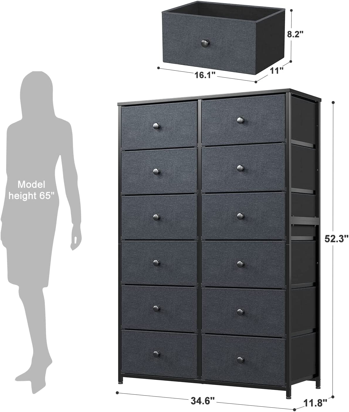 【52.3"H TALL DRESSER FOR BEDROOM WITH 12 FABRIC DRAWERS】According to the needs of the market, we designed the 52.3"h tall chest of drawer for bedroom with 12 removable storage drawers, which takes up a small space, but still providing sufficient storage space to store your clothes, scarves, socks, T-shirts, pants, sunglasses, books and small toys, etc.; keep your room clean and tidy all the time.