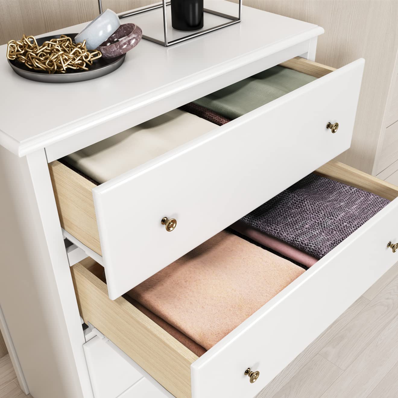 Premium Material - Constructed of high-grade MDF, premium metal slides that can be pushed and pulled smoothly, the white dresser meets your pursuit of quality. The surface is coated with environmentally friendly paint, which is waterproof and easy to clean