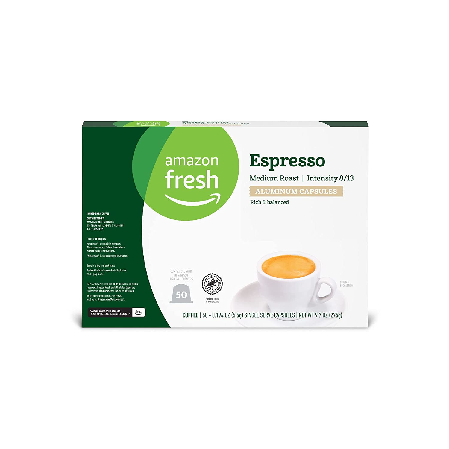 Amazon Fresh Espresso Medium Roast Aluminum Capsules, Compatible with Nespresso Original Brewers, Intensity 8/13, 50 Count (5 Packs of 10)