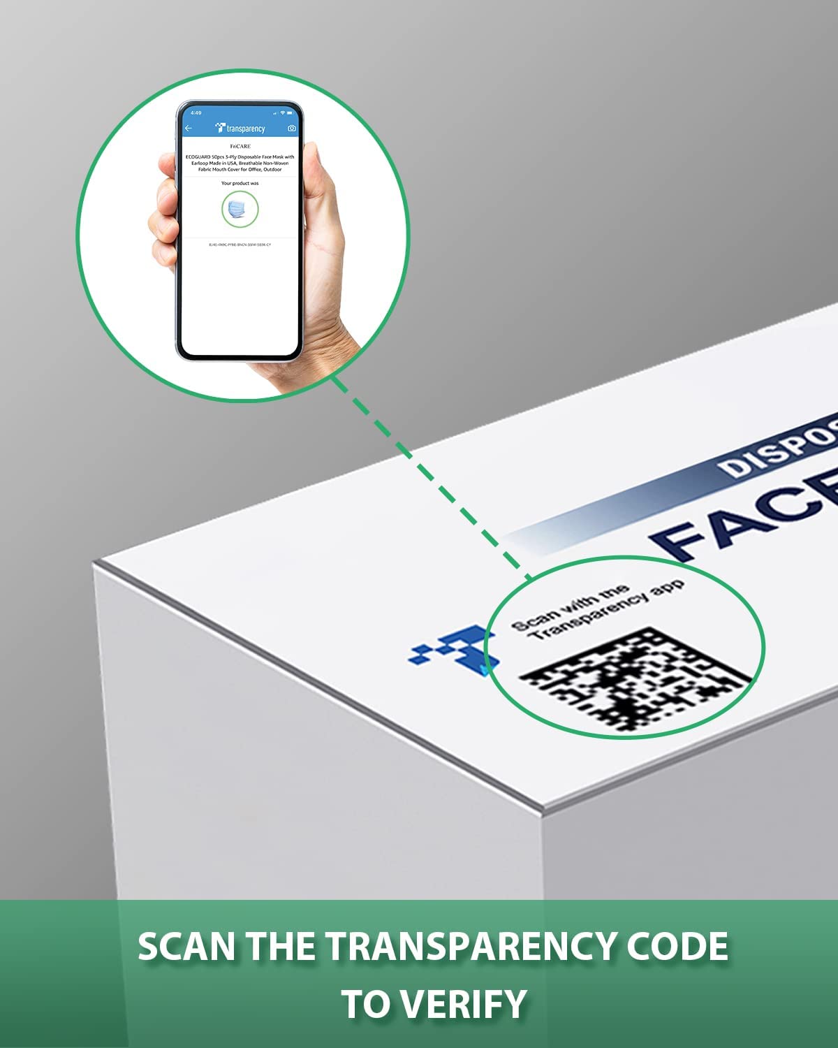 • GENUINENESS GUARANTEED: EcoGuard disposable face mask has enrolled the Amazon Transparency Program. There is an exclusive security code on the box packaging so that you can verify our brand legitimacy by scanning the bar code.