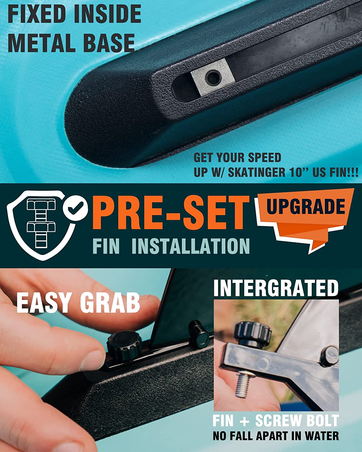 • 【THOUGHTFUL DESIGN & SPECIAL STRUCTURE】 Inspired by octopuses, Skatinger paddle board embodies agility, ferocity and a calm attitude. The design of the front handle and shoulder strap(non-slip‼️) is more convenient when walking and carrying. The structure of fins + bolts makes the fins firmly fixed on the metal base and will not spread out in the water. Removable fins help you maneuver and steer more easily, allowing you to glide across the water like a fish for fun and adventure in the water!