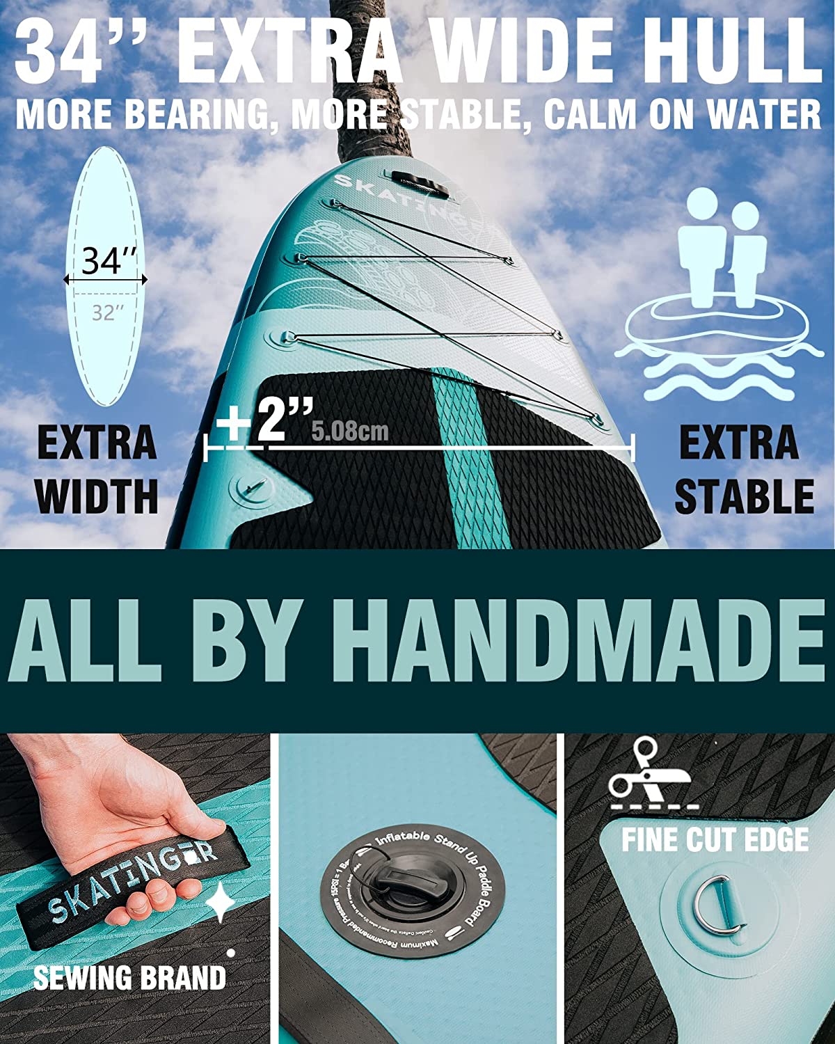 • 【EXTRA SIZE & LIGHTWEIGHT FOR BETTER BALANCE】Skatinger Inflatable Stand Up Paddle Board is made with the golden ratio, 11" x 34" x 6". Only 20lbs deflated and carry up to 420 lbs‼ Extra 2‘’ of width (compared to a 32‘’ board) is designed to provide better stability and striking balance, creating an incredibly versatile board for all skill levels. The paddle board can accommodate two people and suitable for yoga, fishing, surfing, snorkeling, traveling with the dog or kids, and more!