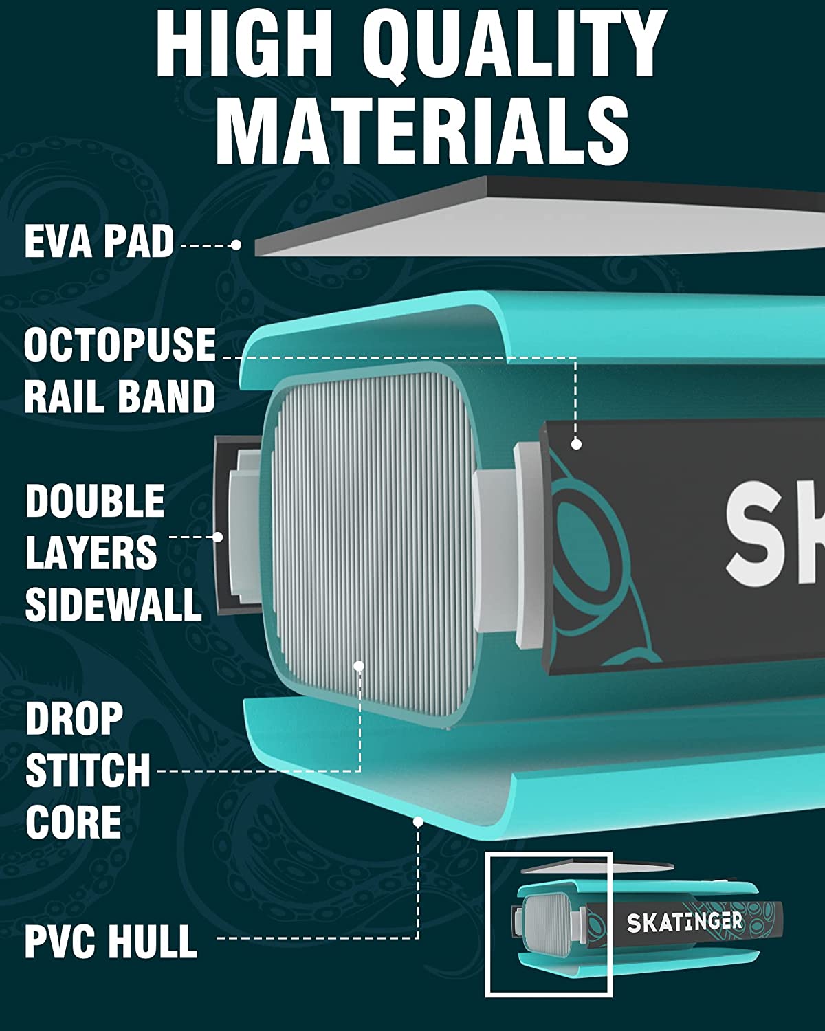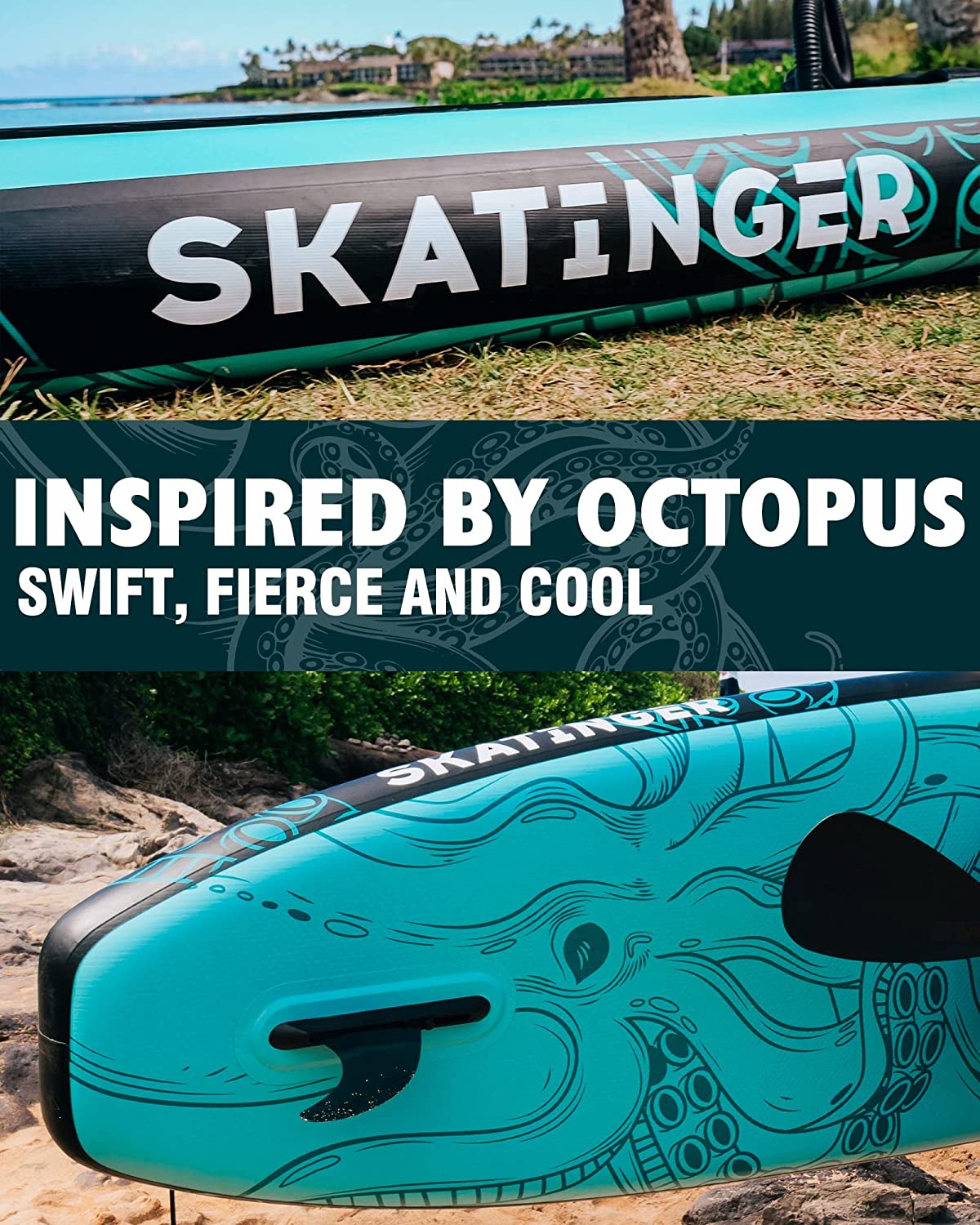 • 【HIGHLY DURABLE MATERIAL】 Non-slip EVA deck pad of the Skatinger inflatable paddle board is designed with a diamond pattern and an octopus shape, and can be inflated to a rock-solid hardness, allowing you to stand comfortably without fear. High-quality military-grade ultra-light PVC material and advanced needle-drop core tech ensure that the inflatable boards has higher compression resistance and elasticity, minimizing accidental injuries, making the ISUP extremely durable.