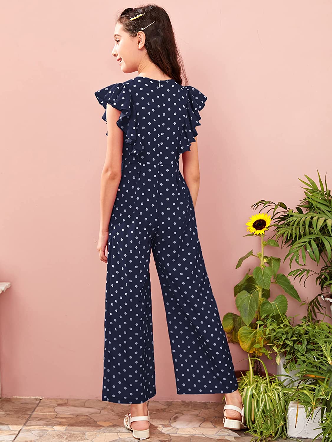 WDIRARA Girl's Polka Dots Ruffle Trim Cap Sleeve Round Neck Wide Leg Jumpsuit