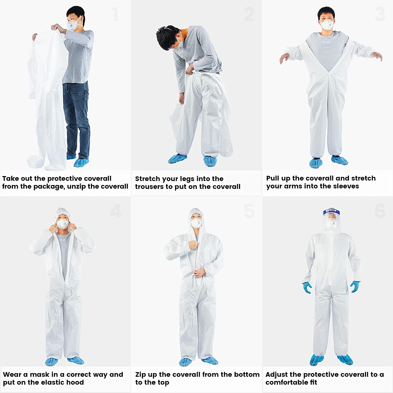 - 【Heavy-Duty Isolation Coverall with 360 Degree Protection】This one-piece white PPE coverall suit features an elastic hood, wrists, and ankles for a snug fit and reliable protection from liquid and particulate. The front zipper allows for easy on and off and the coverall provides full body coverage, shielding skin and clothing from dirt, dust, light liquid splashes, paint, and most mild chemicals and biological agents.
