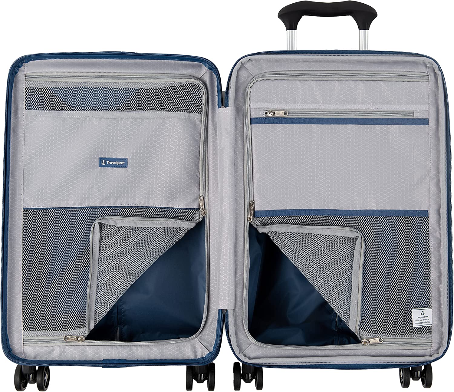 Keep it light when carrying on with the durable, well-equipped, lightweight Maxlite® Air Carry-on Expandable Hard sided Luggage with Spinner Wheels. This blue suitcase has 100% polycarbonate exterior that is engineered to flex if impacted to prevent splitting, cracking or punctures, and a stylish exterior finish reduces visible scratches or scuffs. Great for checking in too, this hardshell luggage has a built-in lock allows TSA authorities to safely unlock and relock the bag for inspection when needed, and a zippered expansion option maximizes packing capacity when needed. The interior lining of this luggage carry on is made from 100% post-consumer recycled plastic bottles to help reduce environmental waste and treated with H2O guard for moisture resistance. This hard shell suitcase has two zippered interior divider panels and built-in accessory pocket keeps everything you pack organized, separated, and secure. Glide with ease on eight smooth-gliding spinner wheels that rotate 360° led by a PowerScope Lite handle that locks in two positions (38” and 42.5”) for users of different heights. A patented Contour Grip with rubberized touch points makes maneuvering easy and comfortable. This spinner hardside suitcase is backed by our Built For a Lifetime Limited Warranty with Trusted Companion Promise that even covers damage caused by airlines or other common carriers for the first year of the lifetime warranty.