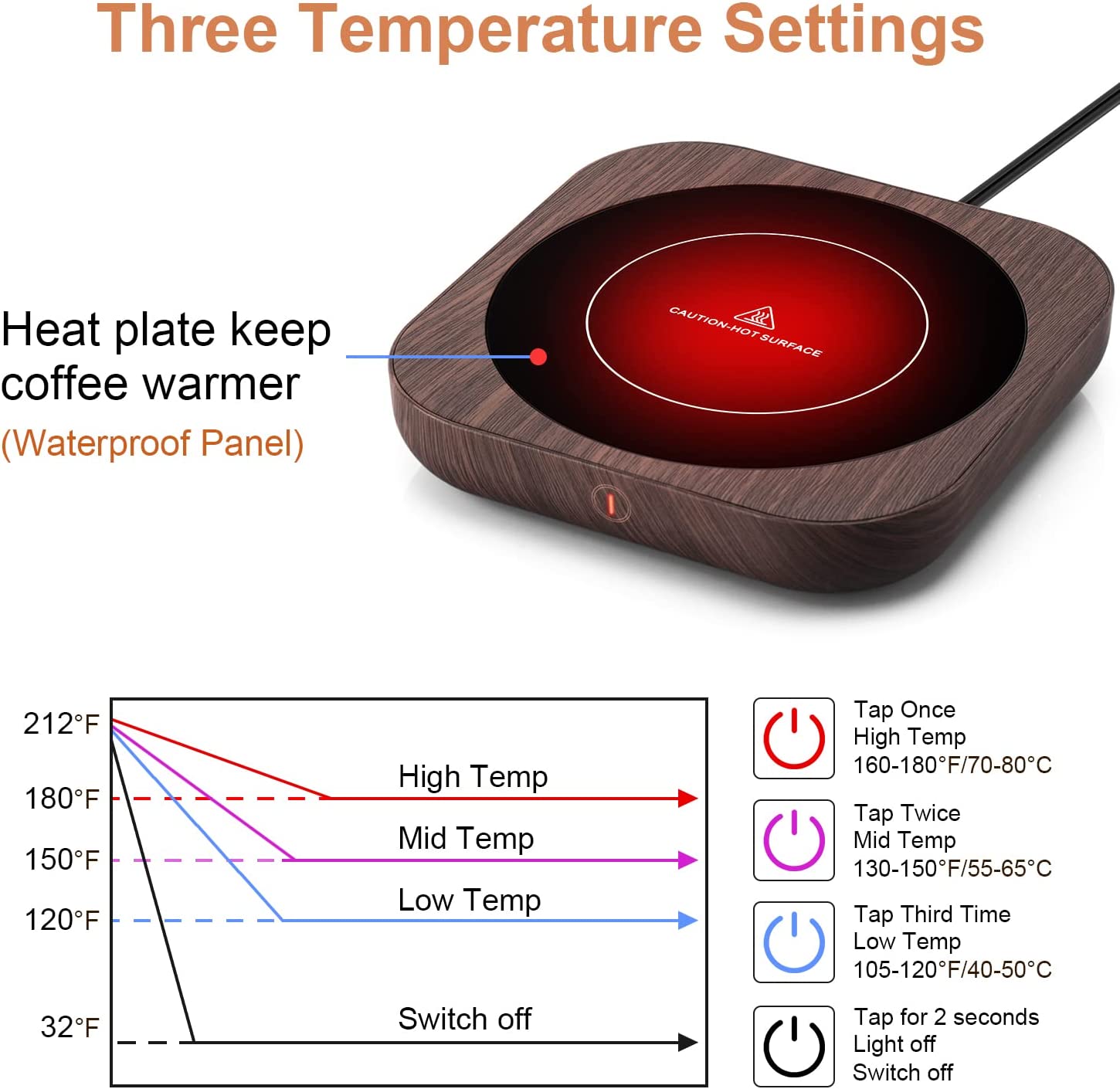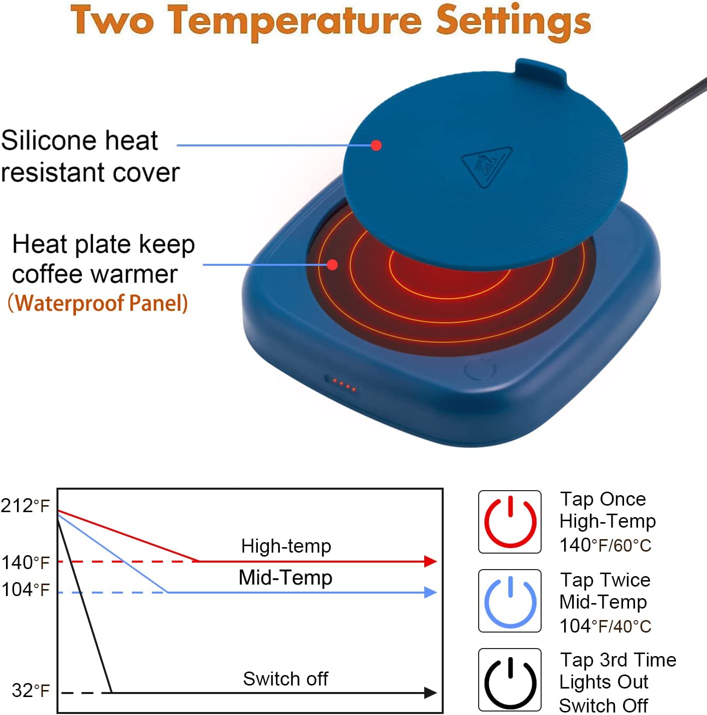 • ☕【2-Temperature Setting】Coffee cup warmer will keep your coffee at a perfect drinking temperature, keeping beverage up to 104℉-122℉/40℃-50℃ or 122℉-140℉/50℃-60℃ by touching the “Power Button”. You can enjoy your hot coffee any time.