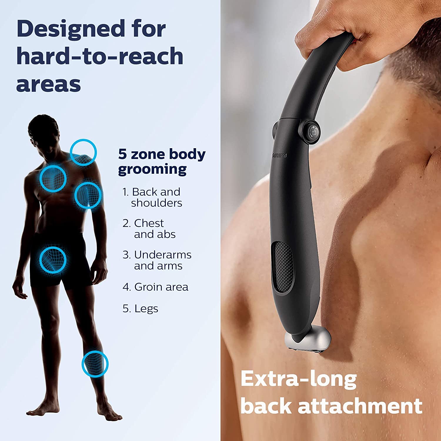• Shave or trim any area on your body, including hard to reach areas like your back, shoulders, chest, abs, underarms, arms, groin area and legs using the extra long attachment.