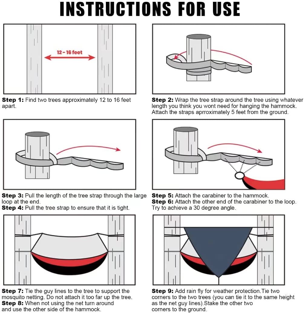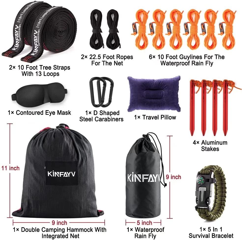 • ☀【Everything Included】: Our camping hammock set includes a Double Hammock with Net and Rain Fly(120*120 Inches), 2*10 Feet Tree Straps with 13 Loops(600 lbs), 2*D Shaped Steel Carabiners, 2*Net Ropes, 6*Guylines, 4*Aluminum Stakes, 1*Travel Pillow, 1*Eye Mask, 1*5 In 1 Survival Bracelet, 1*Pocket/Stuff Sack, 1*Installation Manual. No need to look elsewhere!