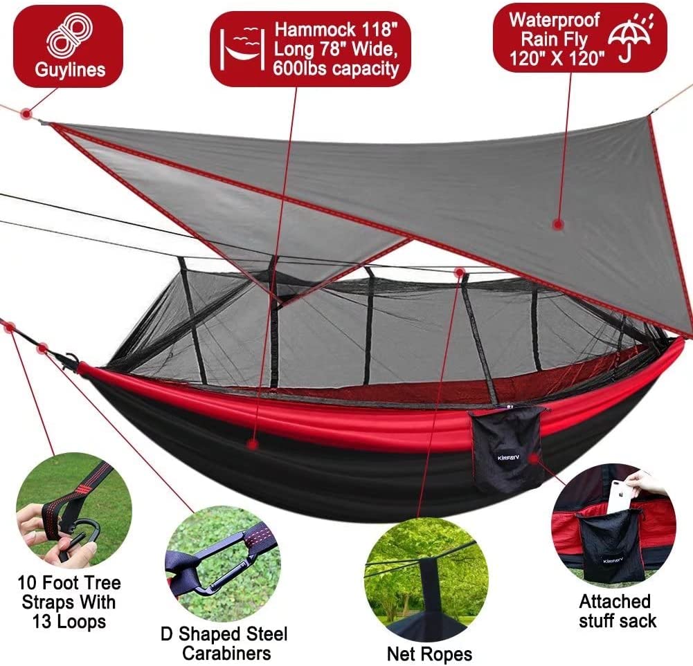 Kinfayv Camping Hammock with Net and Rain Fly - Portable Double Hammock with Bug Net and Tent Tarp Heavy Duty Tree Strap, Hammock Tent for Travel Camping Backpacking Hiking Outdoor Activities,Red