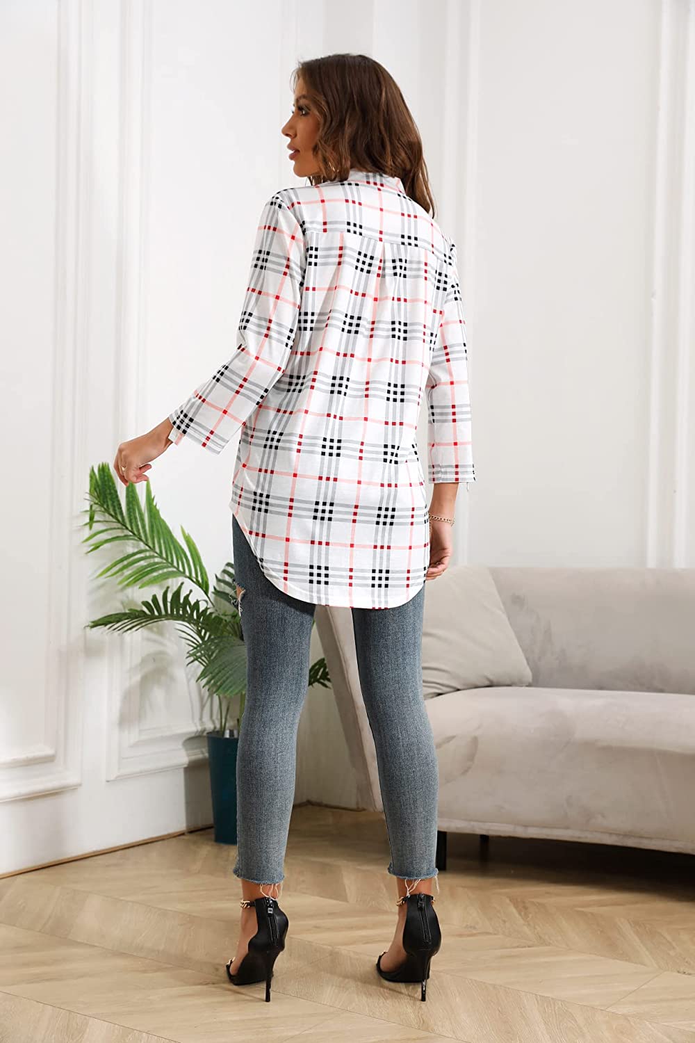 St. Jubileens Women Roll-Up 3/4 Sleeve Plaid Shirt Tunic V Neck Casual Pullover Blouses Tops