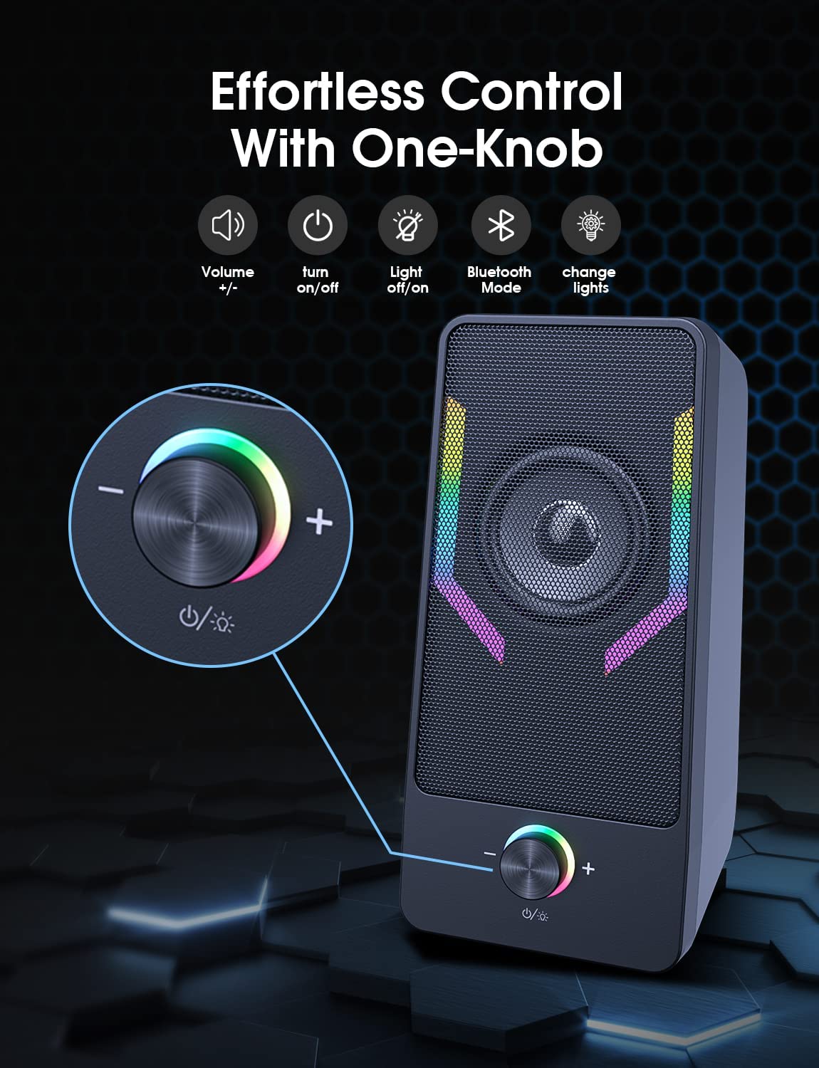 - 【Effortless One-Knob Control】 Delicate one-knob design enables these stereo PC speakers to easily realize ON/OFF, switch light mode, switch mode, and volume up and down instead of complicated independent buttons.