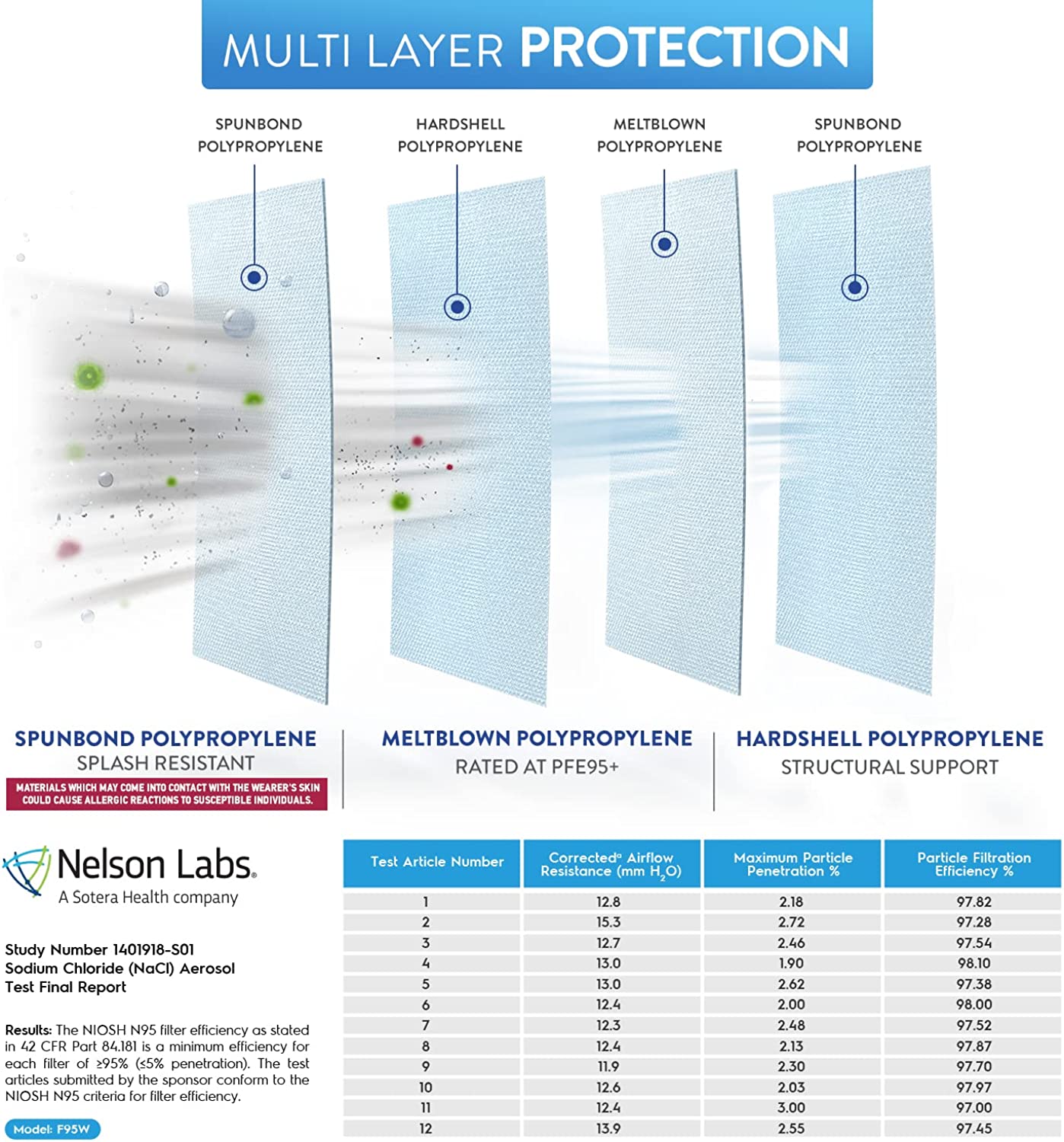 Superior Protection & Breathability - BNX’s multi-layer filtration technology provides maximum protection, comfort and breathability. The active filter layer of these N95 masks is composed of ultra-high grade electrostatically charged meltblown polypropylene. Extremely breathable up to 50%+ more breathable than NIOSH minimum requirement.