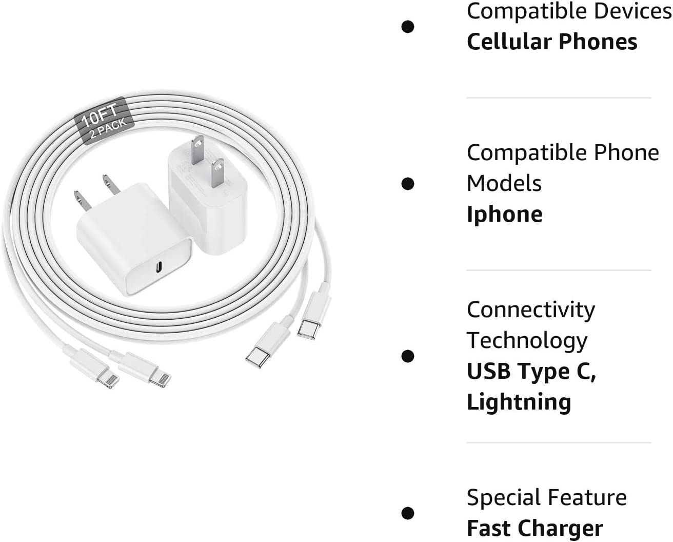 iPhone 14 13 12 11 Fast Charger, [MFi Certified] 10 FT Long USB C to Lightning Cable with 20W USB C Apple Rapid Charging Block, Adapter for iPhone 13 12 11 Pro/Mini/Pro Max/X/8/iPad, 2 Pack