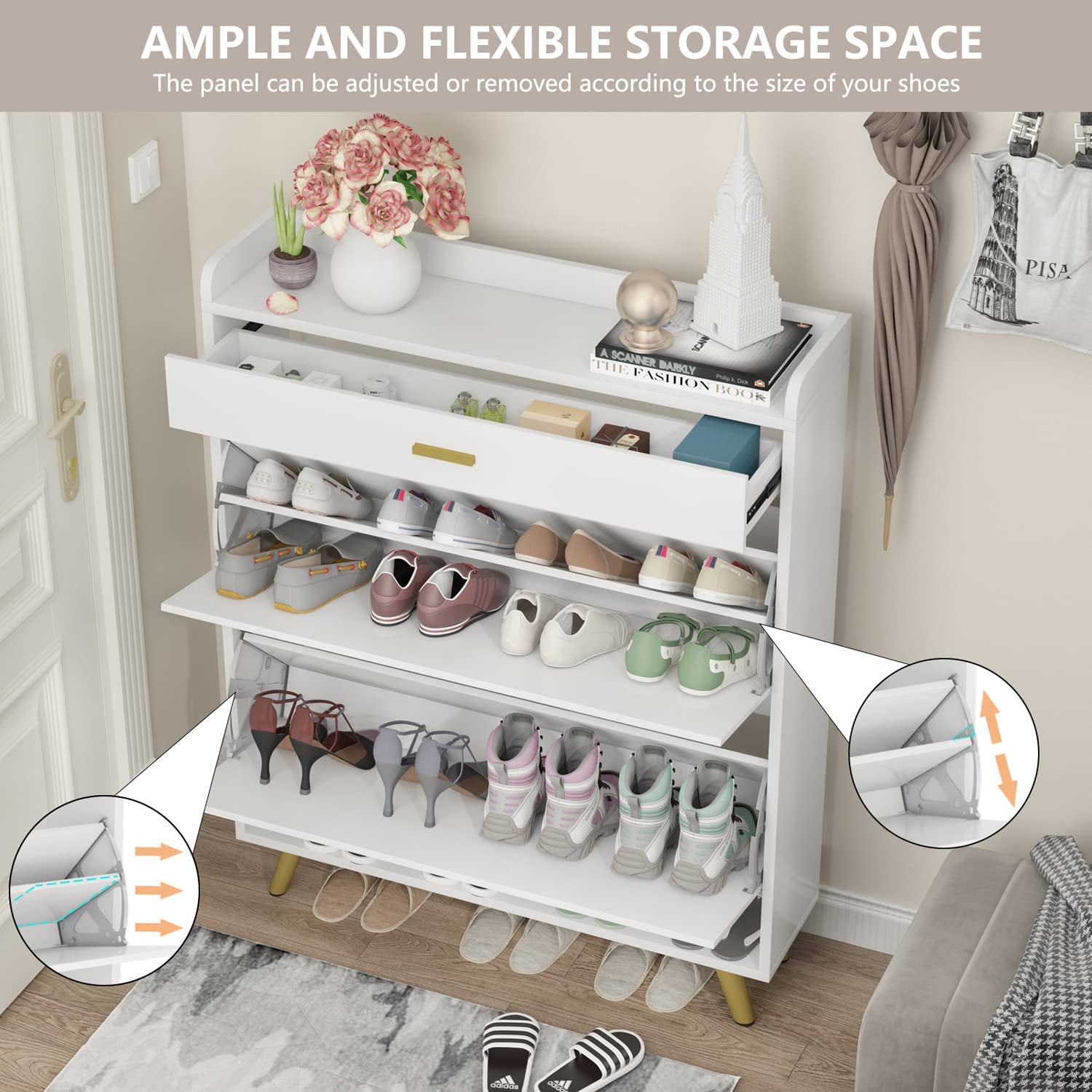 【Strong & Sturdy】 - The shoe storage organizer is made of premium quality manufactured wood. Connotation two fold-out parts are made of iron. The whole shoe cabinet is elegant and sturdy, made to last.
