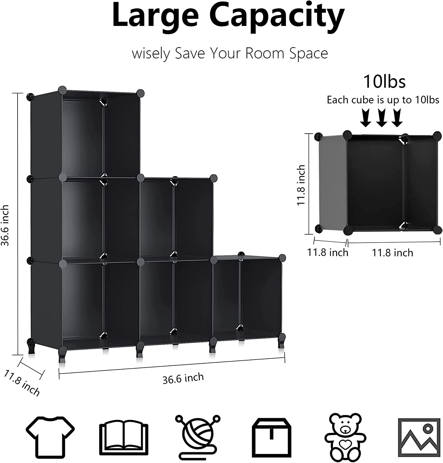 Ample Storage Space: It's a ideal shelf, The size of each cube is 12"D x 12"W x 12"H, The product measures 12"D x 37"W x 37"H. You can store as many things as you want with 6 cube storage racks for your everyday storage needs