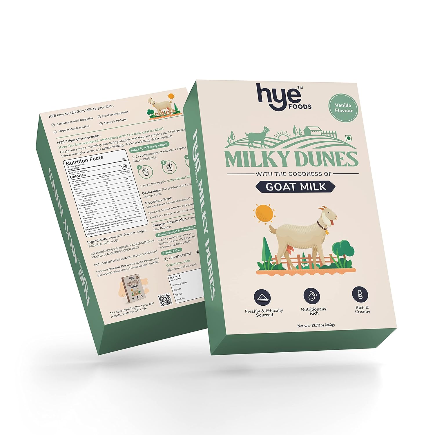 Hye Foods’ Milky Dunes Vanilla Goat Milk Powder is Lab-Tested and Manufactured in FDA, BRC, FSSAI, HACCP, and ISO-Certified plants.