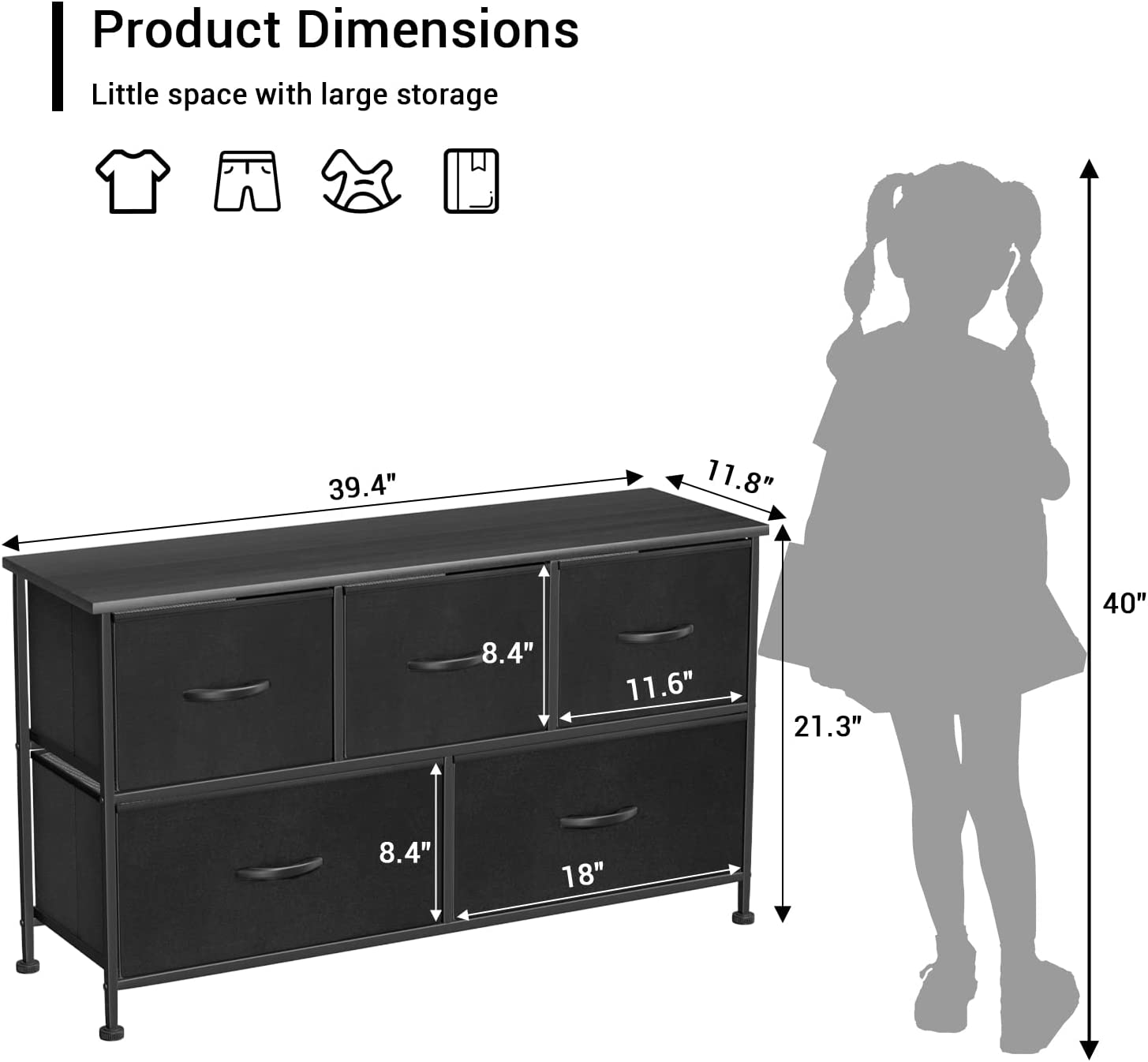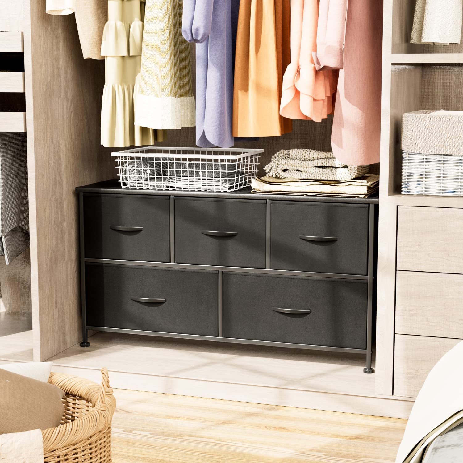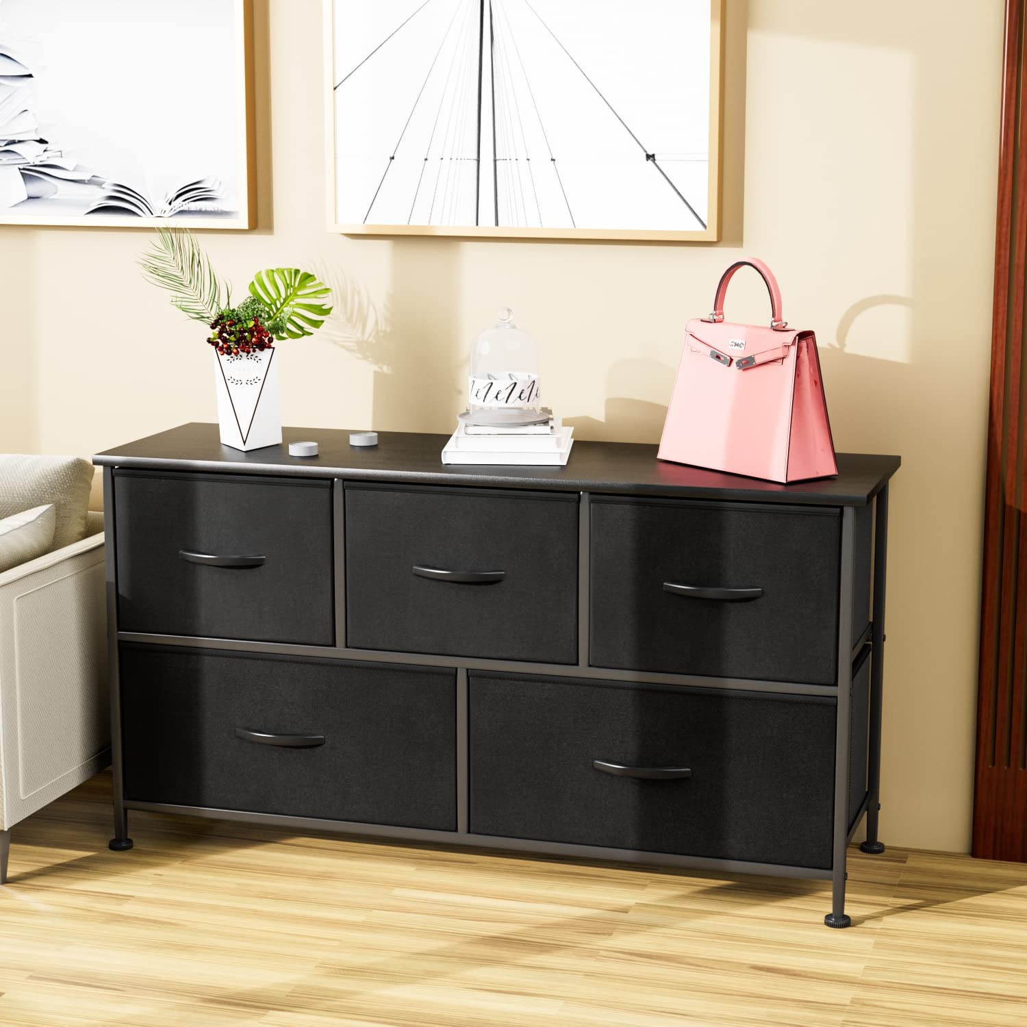 Devoko Dresser for Bedroom with 5 Drawers, Wide Chest of Drawers with Fabric Bins, Storage Organizer Unit with Steel Frame and Wooden Top for Living Room, Closets, TV Stand,Hallway and Entryway