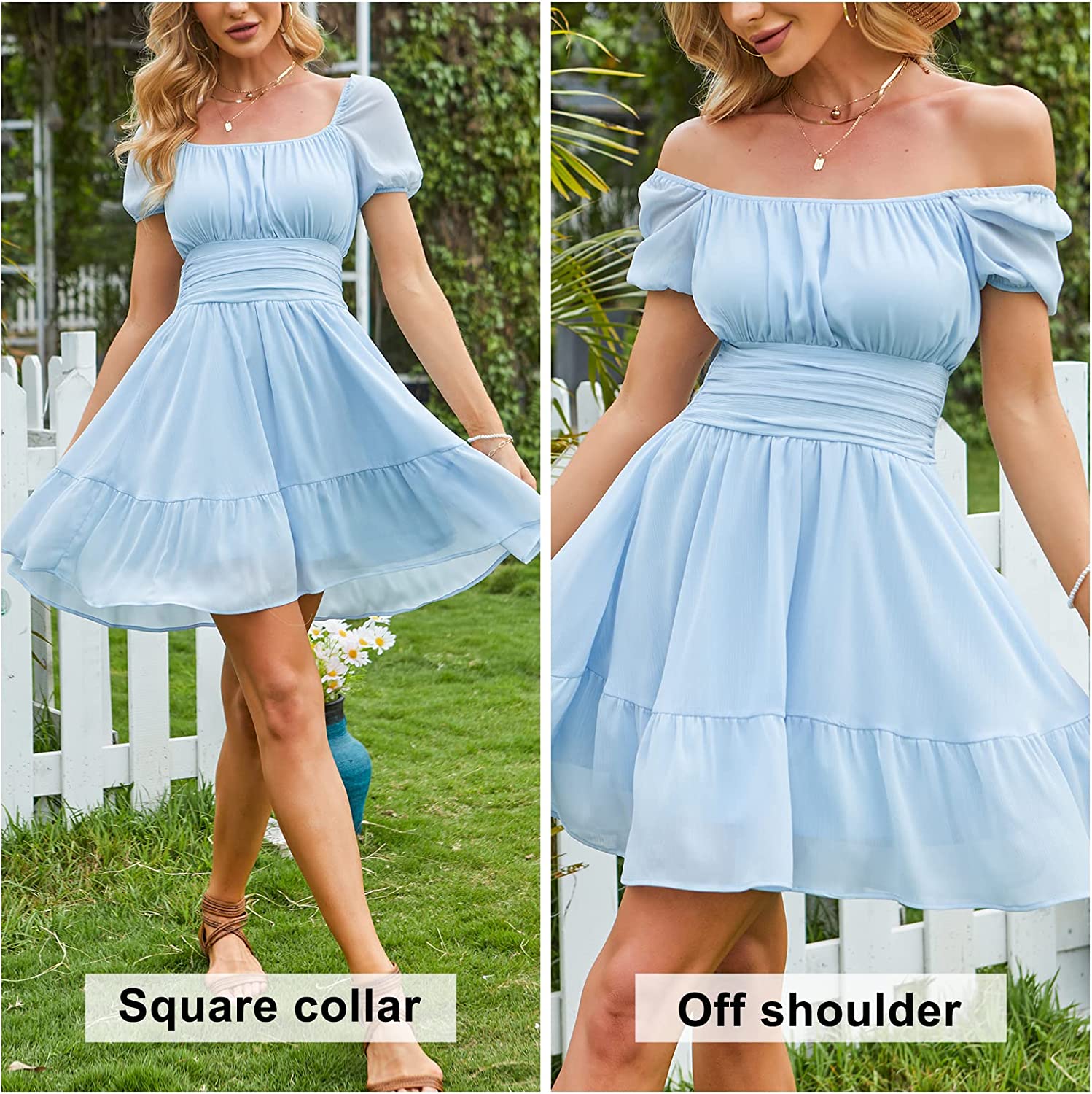 • Design: Square neck, off shoulder, ruched bust, puff short sleeve, smocked, elastic waist, high waist, A line silhouette, solid color, mini dress, frill hem, flowy swing dress, open back