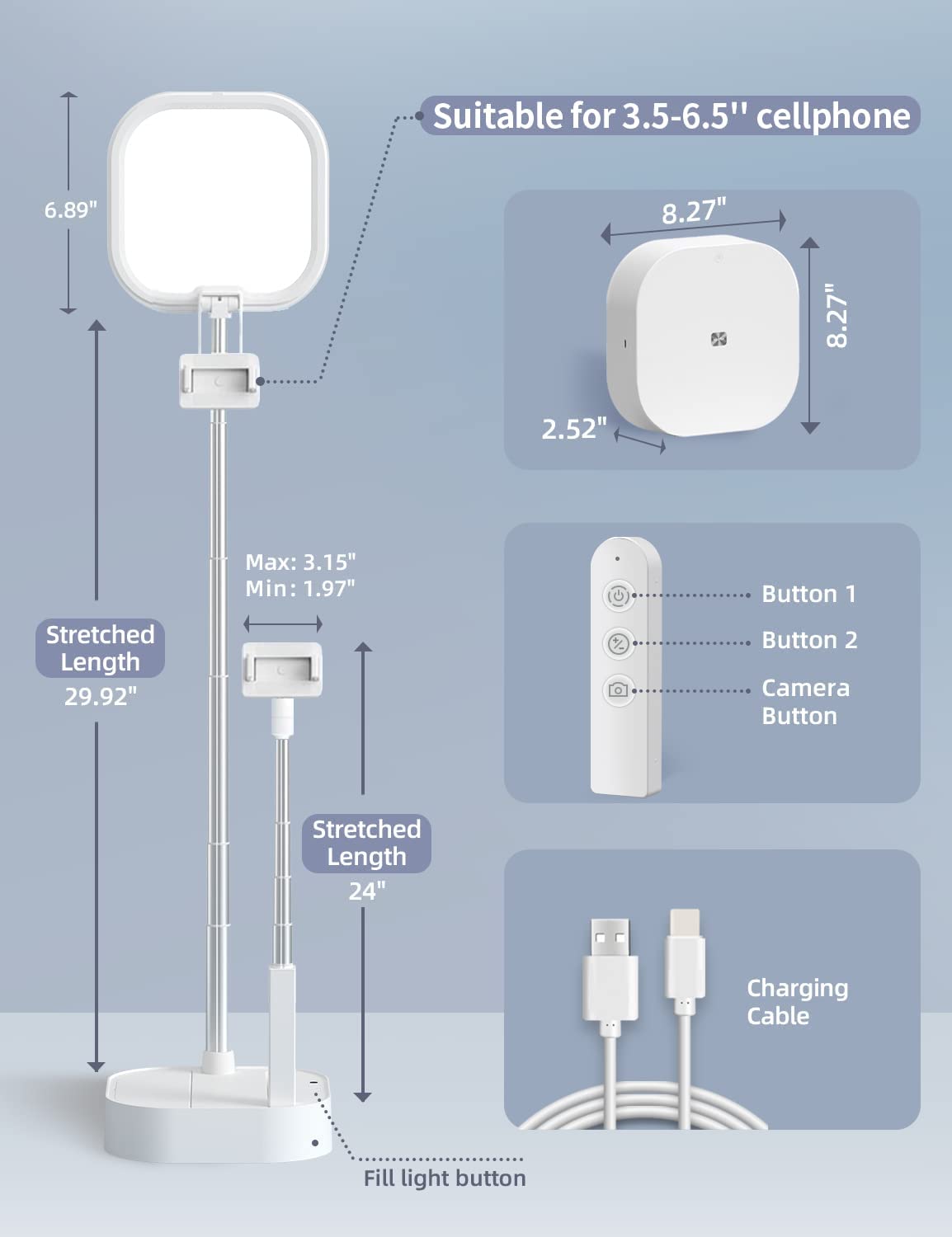 [More Applications&What's included] Great for make up, selfie, TikTok /YouTube/ins video recording, live streaming, Facetime, Zoom Meetings, Vlogs/Bolgs, Video Calls, online tutorial, create content , as a desktop lamp for reading book etc. What's in the box:1 X Foldable Stand, 2X phone holder, 1 X Cable,1X Remote Control Shutter,1 X User Manual.