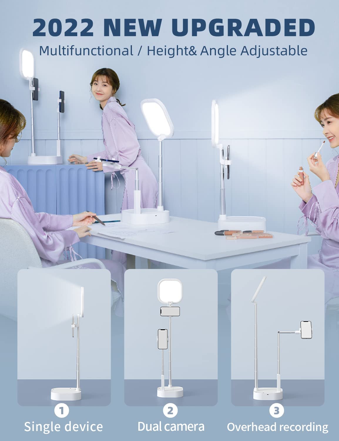 [Adjustable& 360° Rotation] Main pole height adjsutable up to 35'' , front holder can be extended up to 22", used as a floor stand or desktkop selfie stand occasions. 360° rotate phone clamp and 180° rotate light board, easily to switch between different angle to match your shooting angle needs .The joint of front holder is 90° bendable which supports overhead recording.