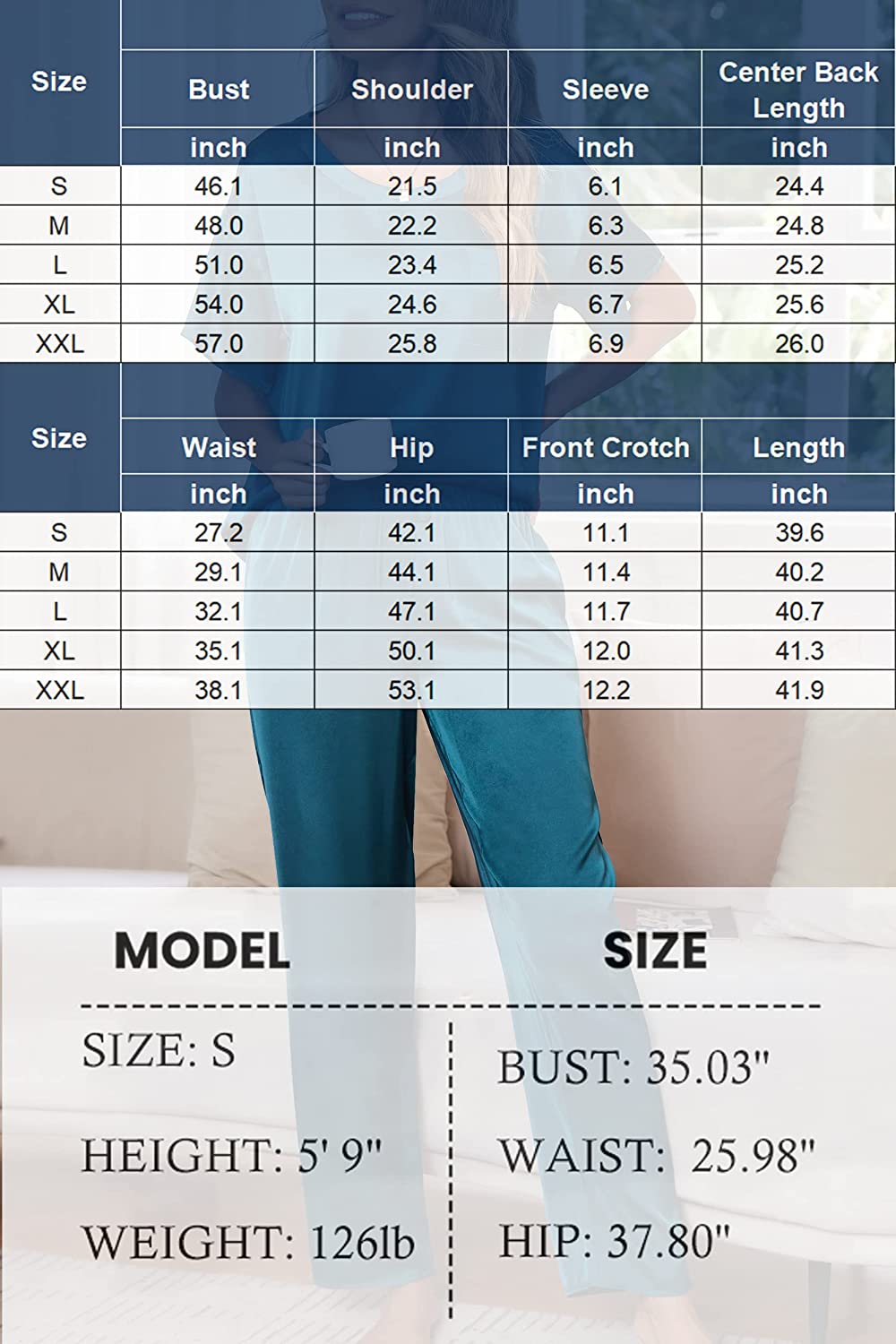 A lightweight two-piece pajama set featuring a pullover tee top and long pants. Soft satin silky fabric, comfy to wear.