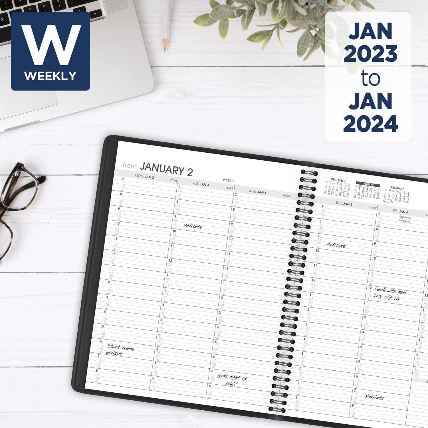 Guaranteed to last all year. Confidently face every deadline, special events and more. The AT-A-GLANCE Weekly Planner covers 13 months from January 2023 - January 2024. Plan your schedule without fear of distracting ink bleeding. Our improved, high-quality paper is designed for superior ink bleed resistance, which keeps plans neat and legible. Each day Monday-Saturday has a ruled column with 15-minute appointment times, while Sunday are condensed. Each page measures 7" x 8-3/4", with one week per two-page spread. Take charge of your schedule with classic style. Planner has a black faux leather cover and twin wire binding. Expand your organizational skills with special pages. Includes a personal information page, 3 year reference calendar and telephone/address pages. ACCO Brands will replace any AT-A-GLANCE planner that is returned within one year from the date of purchase. This guarantee does not cover damage due to misuse or abuse. Contact ACCO Brands Consumer Affairs for instructions.