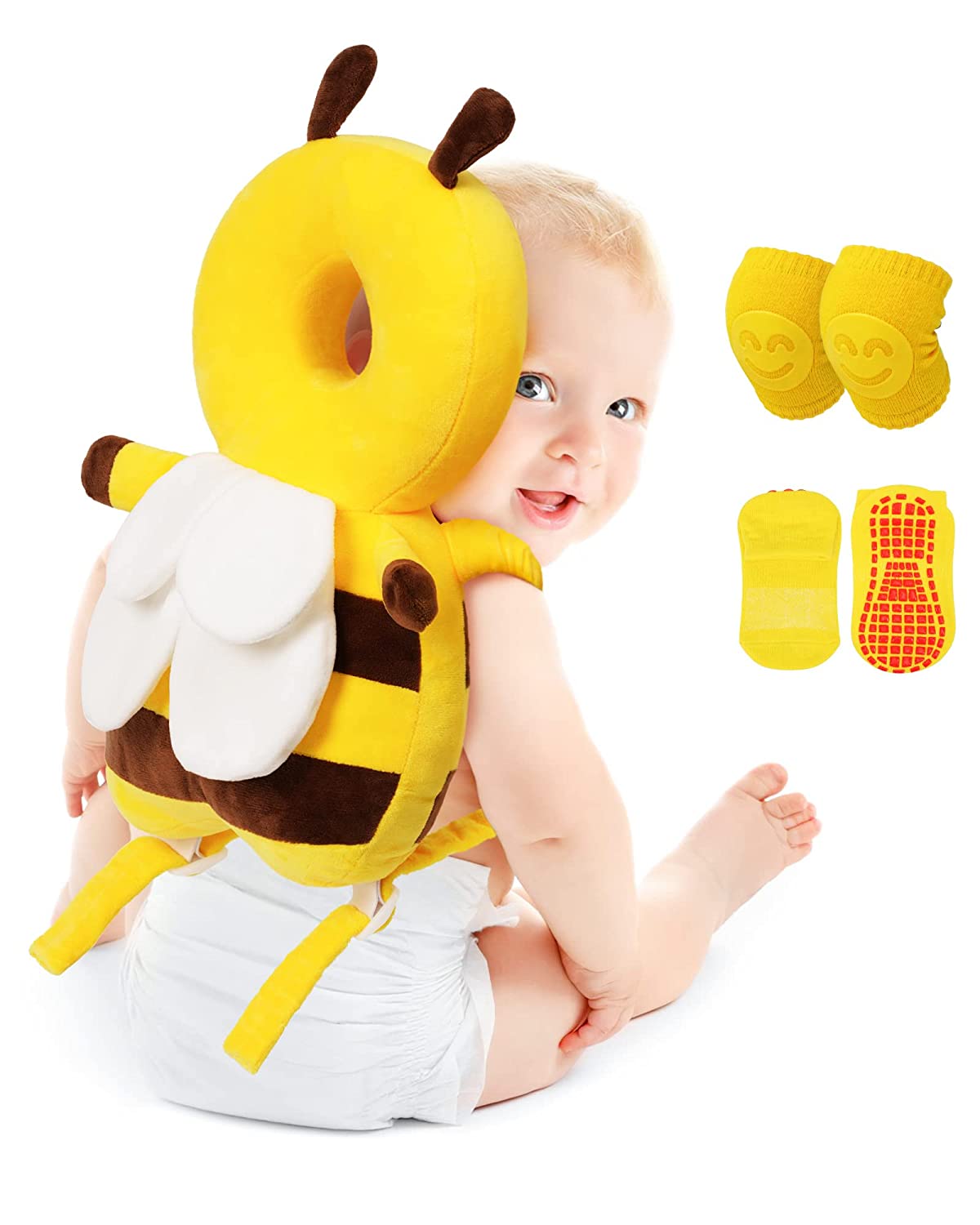 Baby Head Protector Cushion Toddler Head Protection Pillow Baby Backpack with Knee Pads&Anti-Slip Socks (Bee - Crystal Velvet)