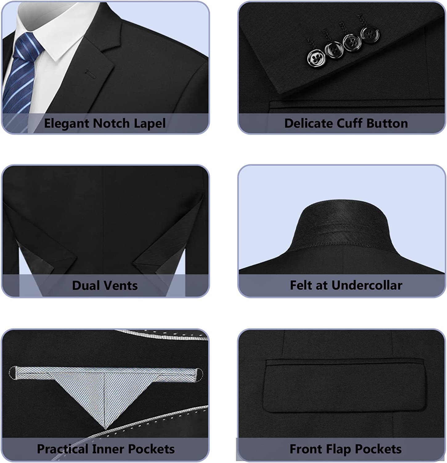 【MEN'S SUIT STRUCTURE】 Jacket: Single breasted one button closure/ Notch lapel/ 3 Practical inner pockets/ 4 Sleeve buttons each side/ 2 Front flap pockets/ 1 Real handkerchief pocket; Pants: Flat front/ Expandable waist/ Invisible zipper/ 2 Real back pockets; Vest: 5 buttons/ V-neck vest.