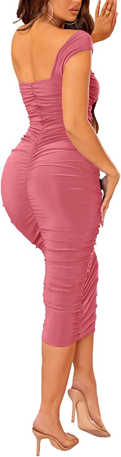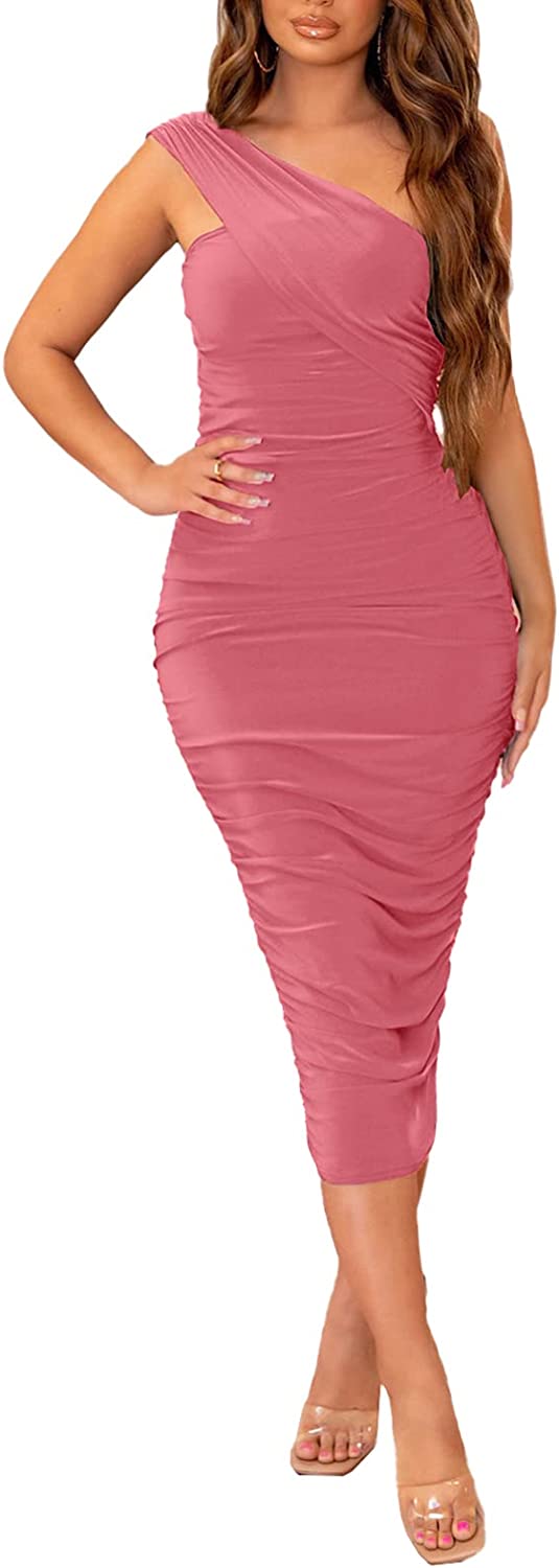 Feature: Sleeveless, adjustable one shoulder/off shoulder, ruched back, slim fitting, midi length, solid color, suitable for most body shape, make you looks more sexy and elegant