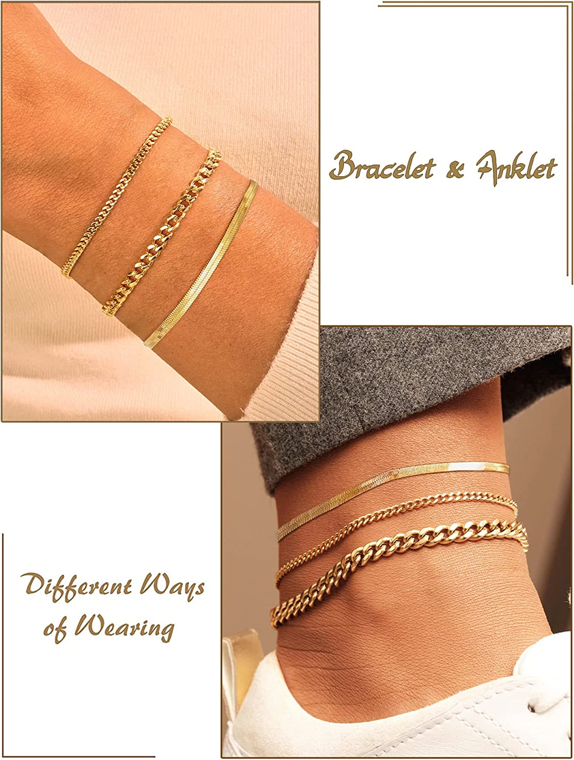 • 【3Pcs GOLD ANKLETS SET】:? Set contains: ①Thin gold cuban link anklet ② thick gold cuban link anklet ③herringbone anklet. These anklets are suitable for layering as well as being worn alone.