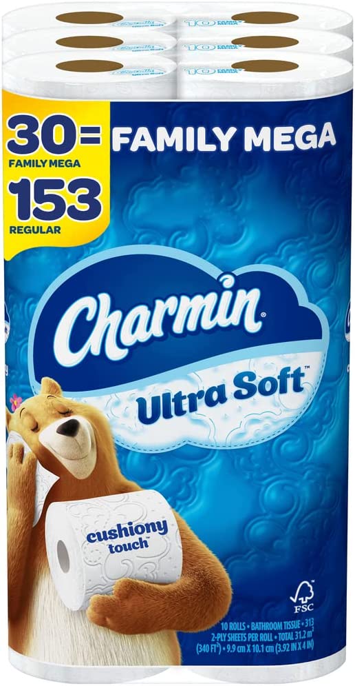 Charmin Ultra Soft Cushiony Touch Toilet Paper, 30 Family Mega Rolls = 153 Regular Rolls