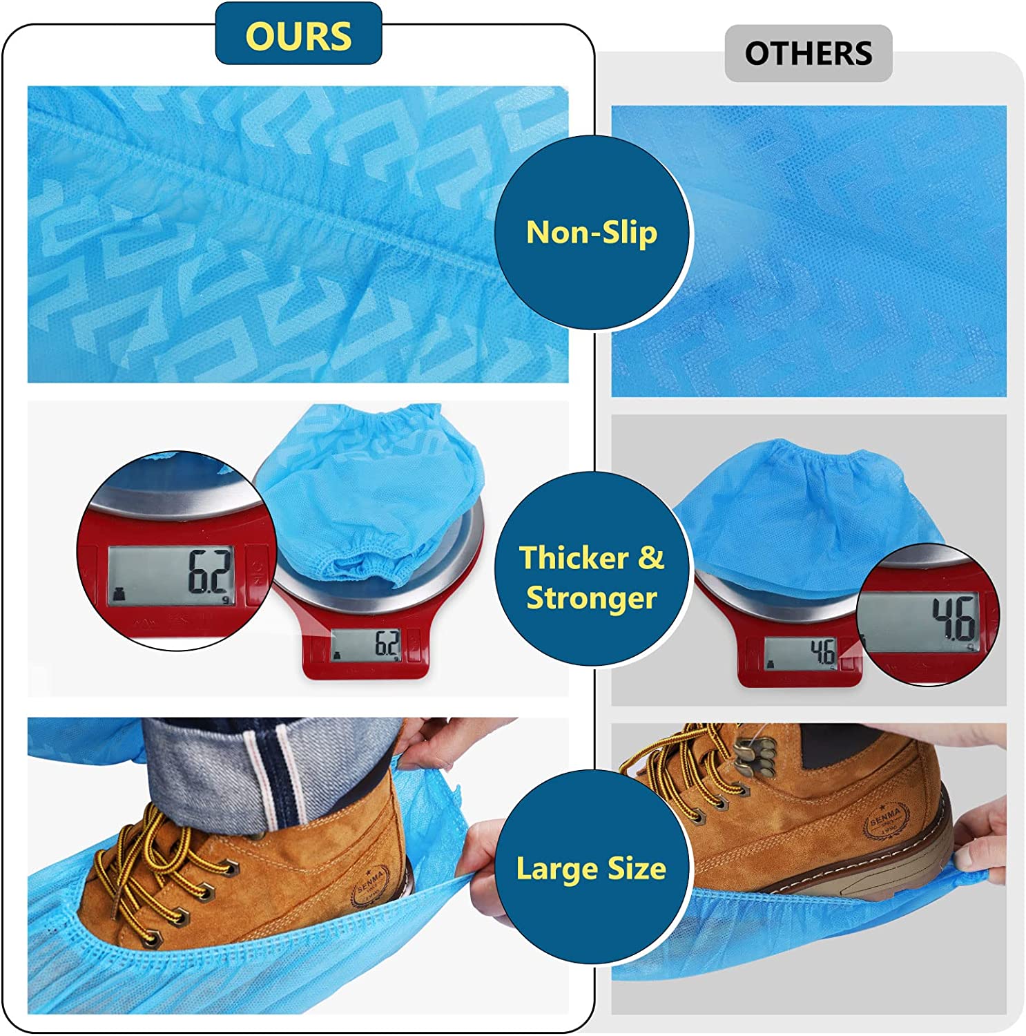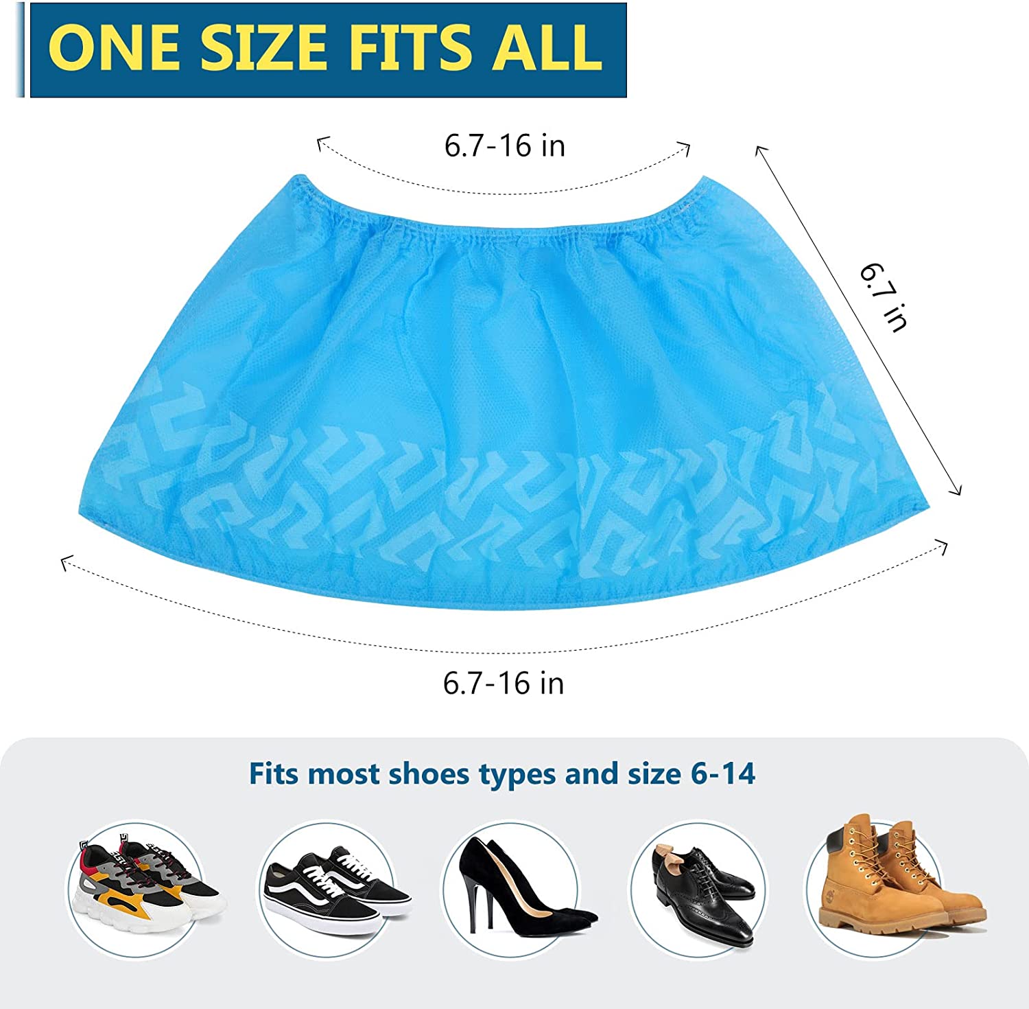 - Larger Size: Stretchable size about 16.9" in length, 6.7"(W), shoe covers contain an elastic band for flexibility, suitable for shoes size 6-14 (upto US Men's work boots 12).