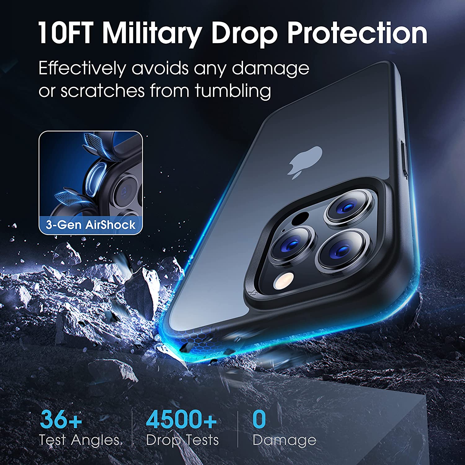 • [10FT Military Drop Protection]: This iPhone 14 Pro Max case meets up to 3x the Military drop-test standard, equipped with the 3-Gen AirShock airbags, explosion-proof backplane and Buffer-frame to reduce the lens damage rate by 90%, the screen damage rate by 85%, and the back damage rate by 80%, which can protect your phone even from a 10ft drop onto concrete.