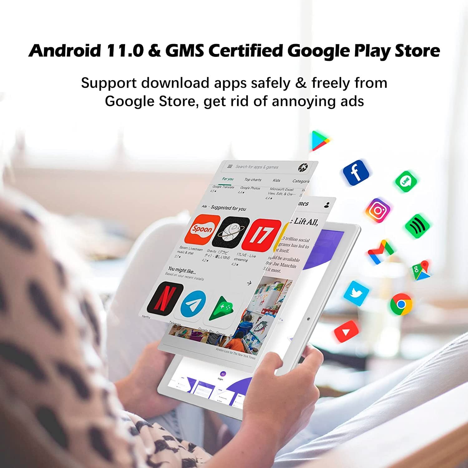 • 【Strong and High-Performance Processor】--This smart Android tablet is equipped with a powerful Android 11.0 system, The powerful processor makes the apps run faster and smoother, offers you a quick and fluent experience of entertainment. Tablet Android with certification of Google Mobile Service (GMS) and pre-installed Google Play supports Facebook, Twitter, YouTube, TikTok, Line, Instagram and other trendy social apps, Support Microsoft Office Software. 5MP front and 8MP rear with auto focus camera meet the basic needs of video talk and photography.