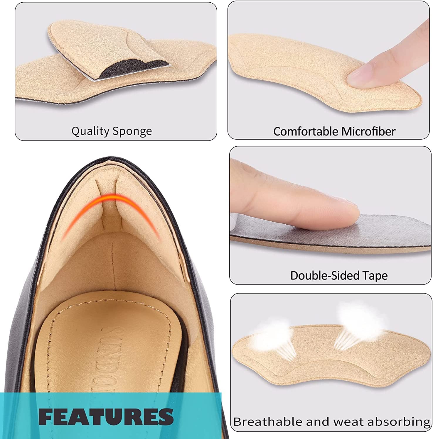 High Quality: These heel cushions are made of durable microfiber and sponge, also come with durable double-sided tape. All these will make sure the cushions will be breathable, comfortable, stick to shoe heel firmly.