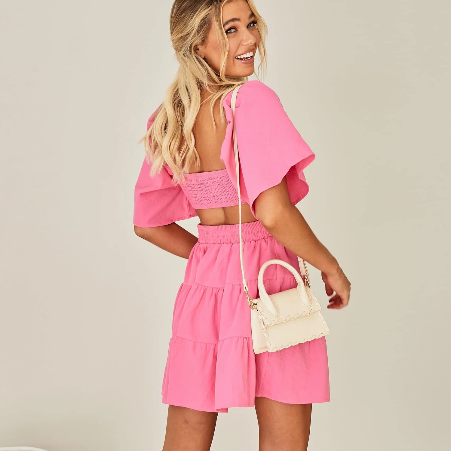 • Design: Flared mini sleeve, Square Neck, Shirred back,Tiered detailing on skirt . A-line design, Mini dress, Short sleeves dress, skater dress, party dress, casual dress.you can get two totally diffetent looks,If you prefer a more sexy look, you can wear it as an off-the-shoulder dress.