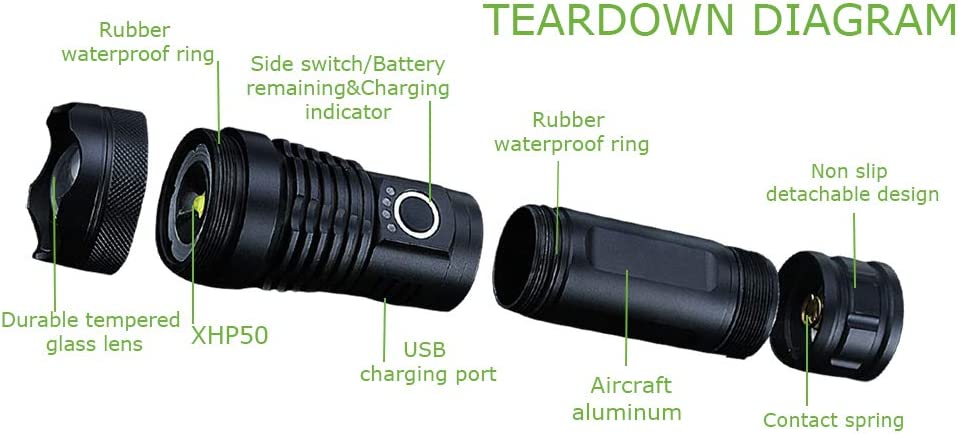 • [Function] The three adjustment methods of tactical flashlight can be adjusted according to different situations (just rotate the flashlight to adjust the zoom). Spotlights are used for long-distance observation, and floodlights are used for large-scale lighting. Two flash modes: flash jump reminder, SOS emergency rescue.