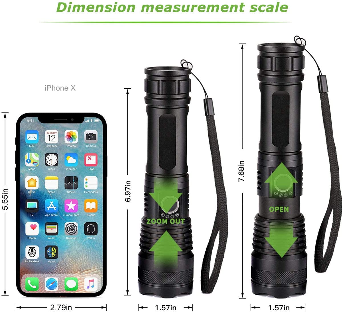 • [Brightness] For the first time, please remove the insulating sheet from the battery. The latest generation of XHP50 LED chip can produce ultra-high output of up to 10000 lumen, with a service life of up to 50,000 hours.The high-power flashlight will ensure high lumen output through heat dissipation, and temperature rise is a normal working state.If it does not work properly, please charge it for 1-2 hours.