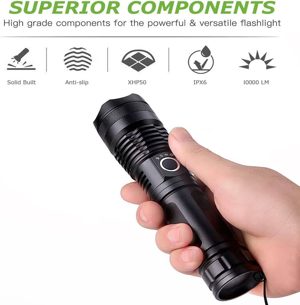 YXQUA 10000 Lumen Rechargeable Tactical Flashlight, XHP50 LED for Hiking Hunting Camping Emergency Outdoor Sport