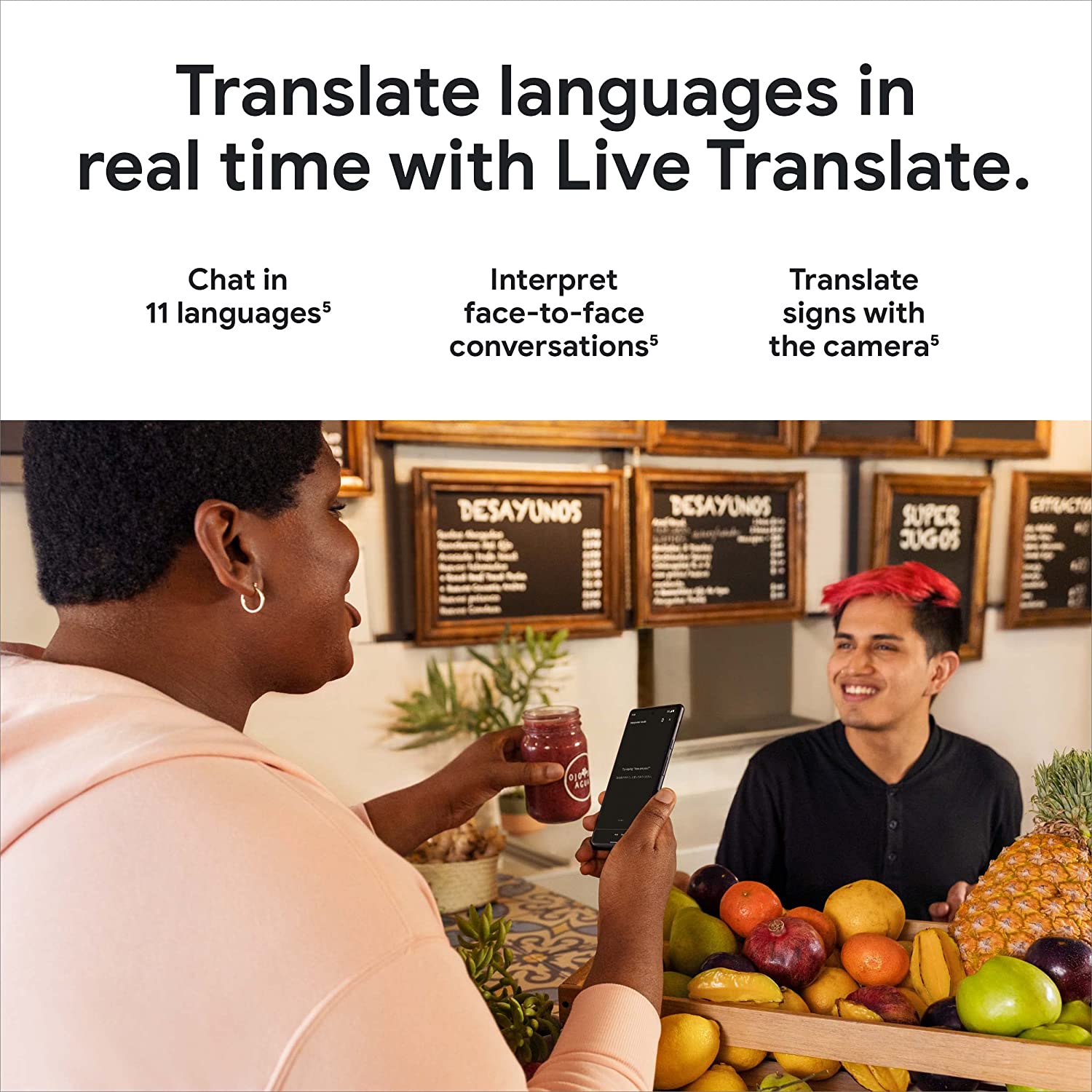 • Live Translate helps you translate live video captions, private chats, and messages, and signs in up to 55 languages right on your cell phone[5]