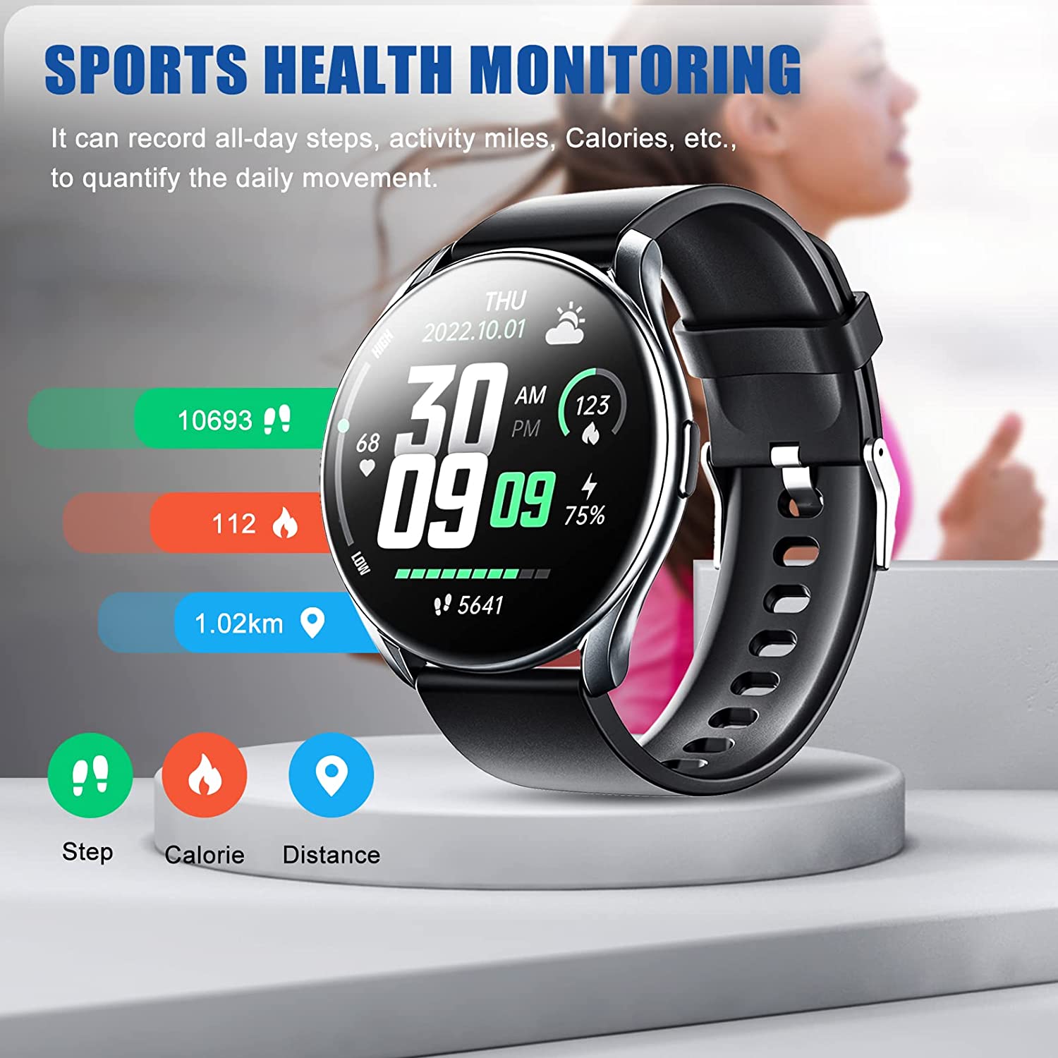 8 Customized Watch Faces 60 Sport Modes-60 sport modes that more accurate to track your activities like heart rate, Calories burned, Steps, Gps record, Sport time, Sport speed and so on.Support multiple reminders and stay connected to your daily life