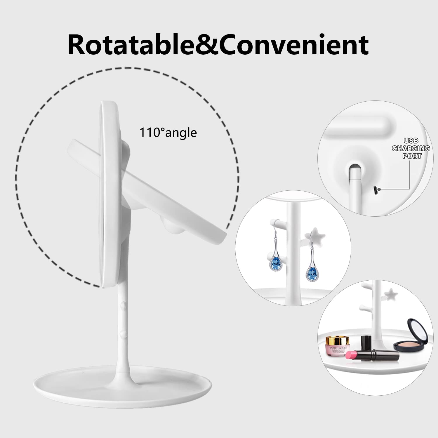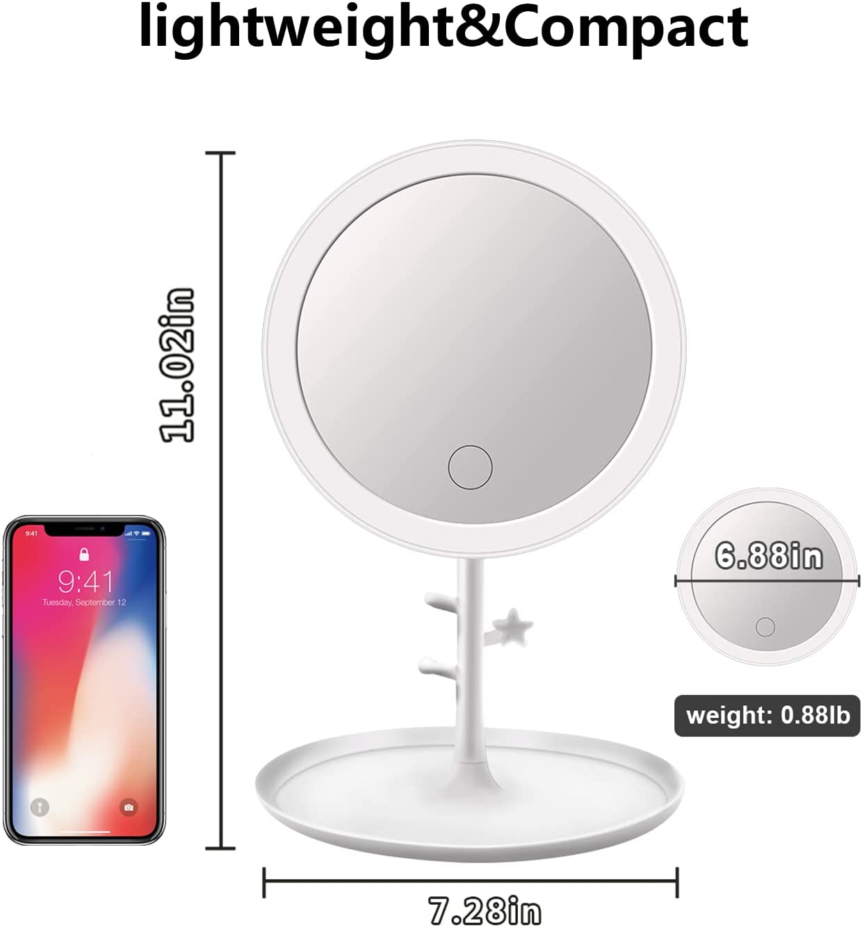 • ✔【Detachagble Design】Compact detachable makeup mirror means you can take it anywhere. The lighted makeup mirror with 90-degree rotation stands on your countertop can be easily adjusted and set at the comfortable viewing angle for makeup. The base recess also holds cosmetics etc