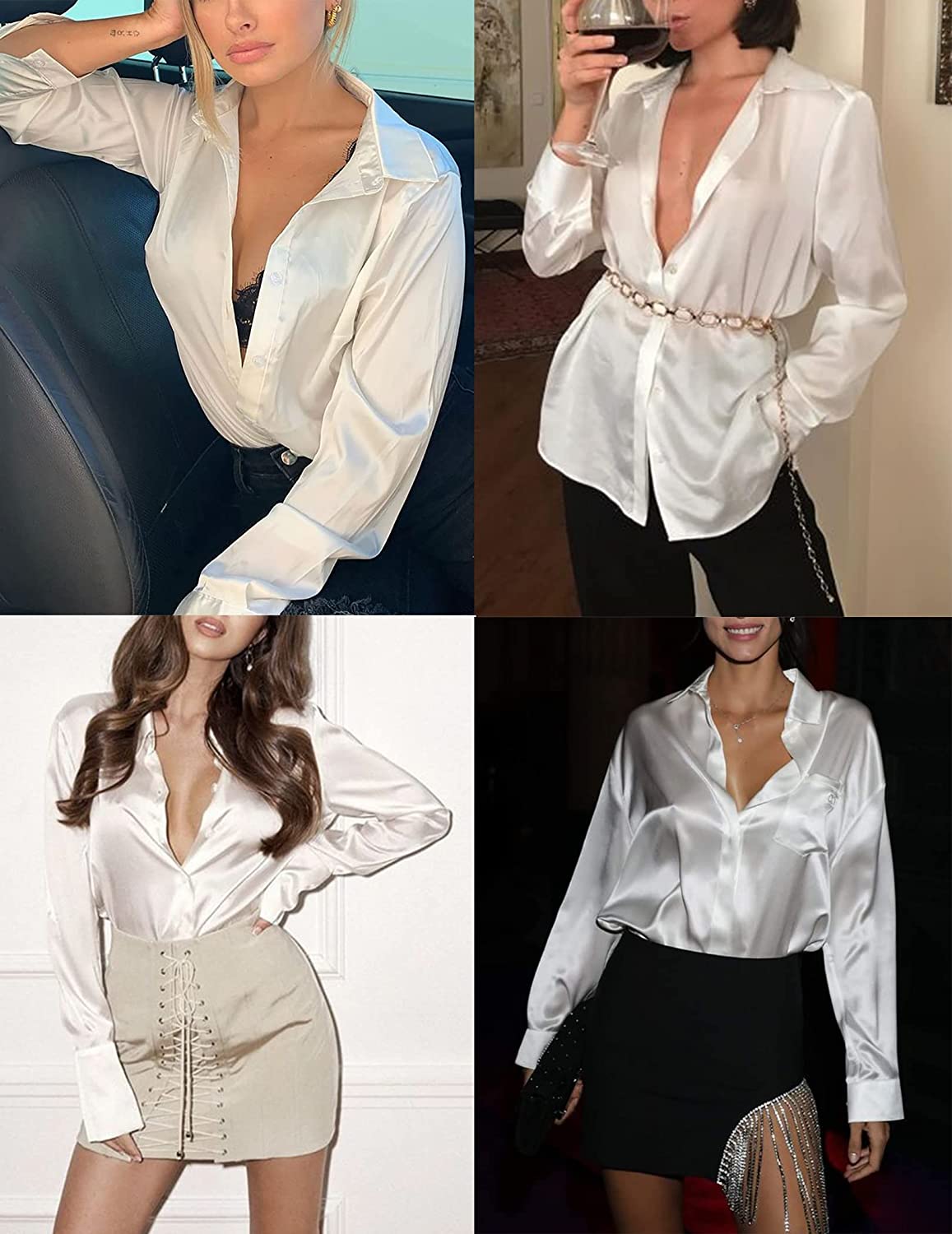 Classic Design - Never goes out of style. Satin silk button down shirts, long sleeve blouses, dressy V Neck tops, casual loose fit work shirt, turn down collar business blouse, drop shoulder tunic tops