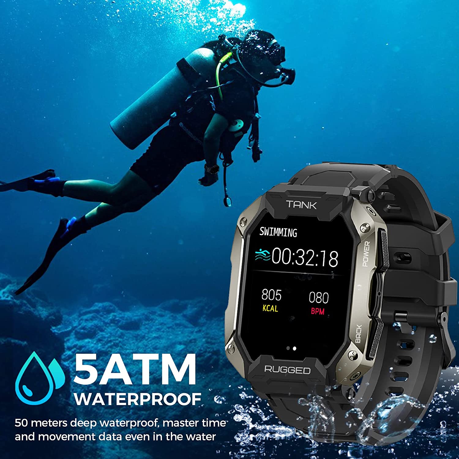 ✅Extremely Resistant to Damage - Fully enclosed slim shell designed android smart watch can be immersed in 50m (5ATM waterproof) deep water. Our military watch is a proven survivor of extreme conditions and has passed the drilling, crushing and hot steam scouring test which makes sports watch suitable to be used in high temperature and high pressure environments