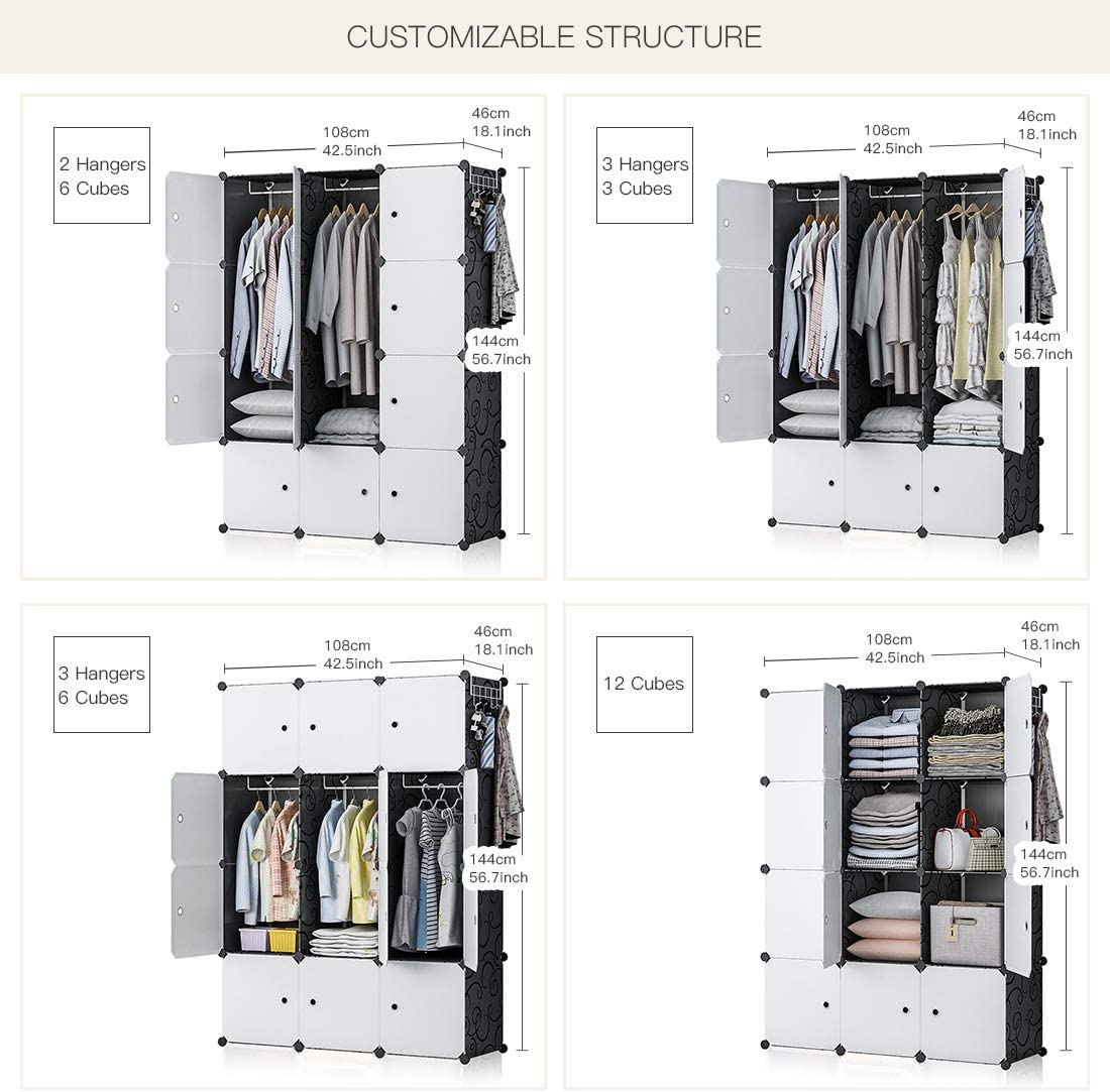 GEORGE&DANIS Portable Closet Wardrobe Cube Storage Cube Organizer Cube Shelf Armoire Bedroom Dresser (42x18x56 inches) 3x4 Tiers, Black
