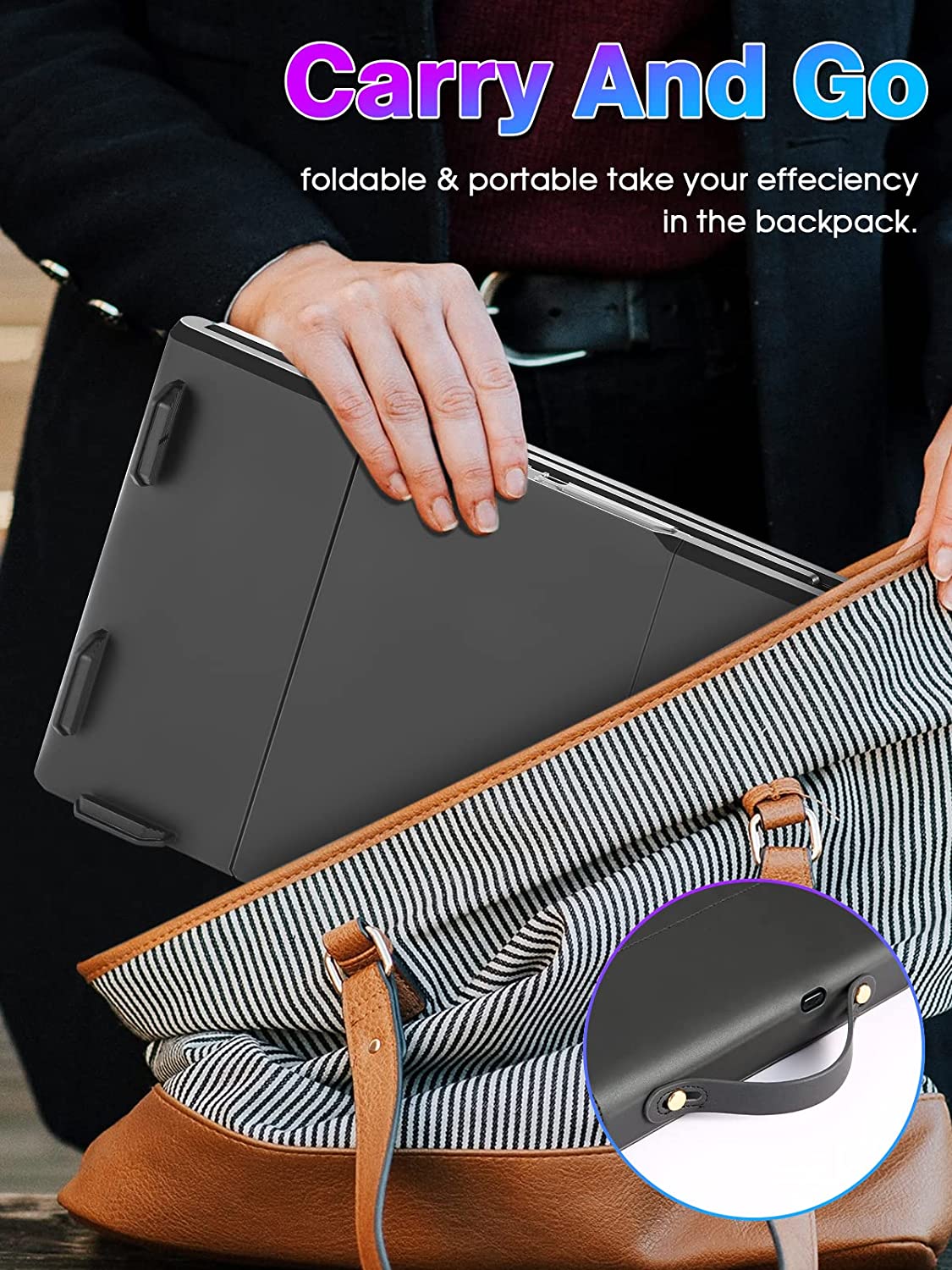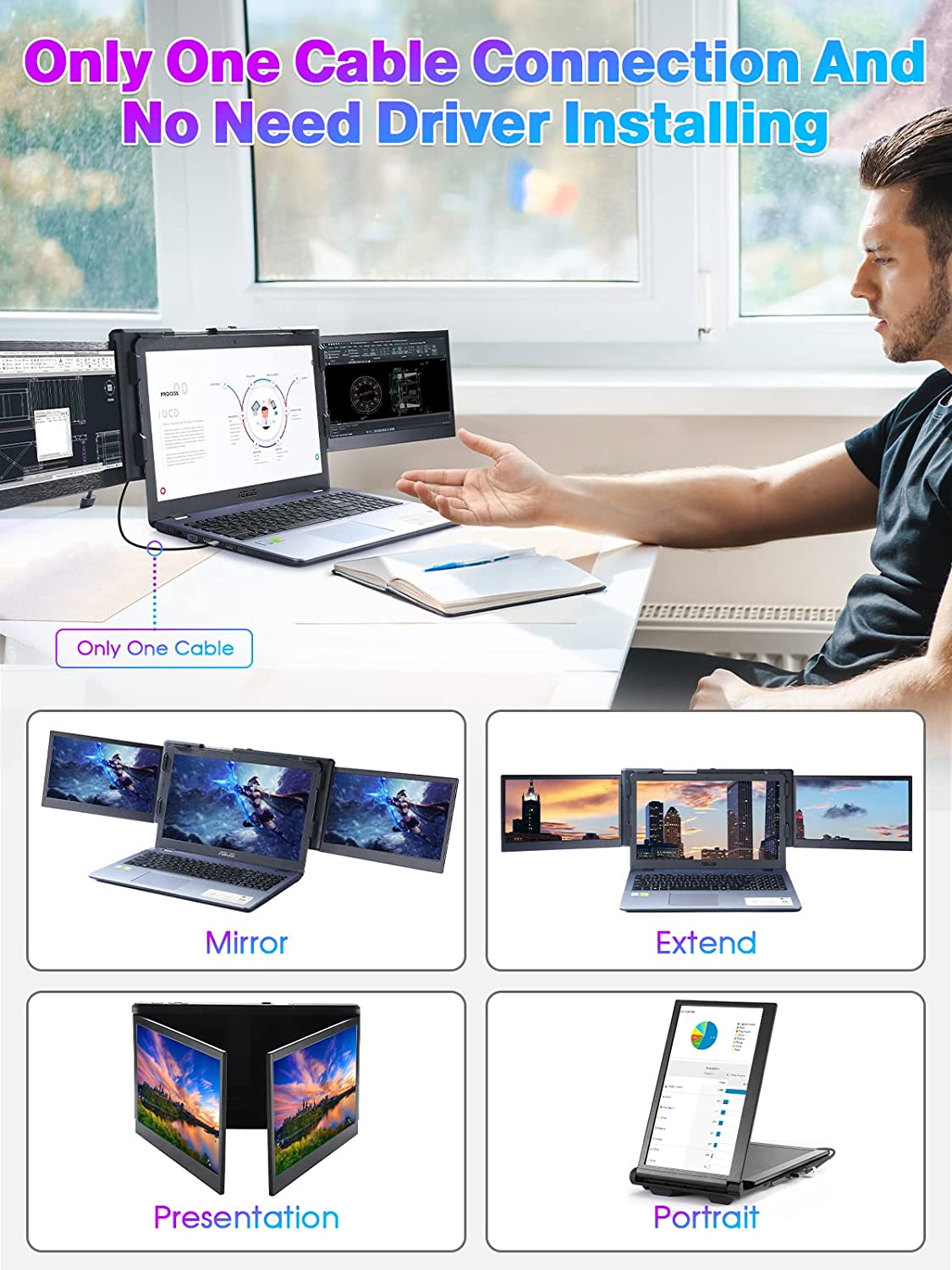 【Easy-to-use design】 The triple portable monitor for laptop can be easily clipped to the laptop frame by just press the button to adjust the size, No need any attachment such as magnets and snaps. Design with a stable and retractable bracket,can be effectively hold the extender to a suitable angle,at the same time prevent the weight of the extender hurt your laptop own screen.