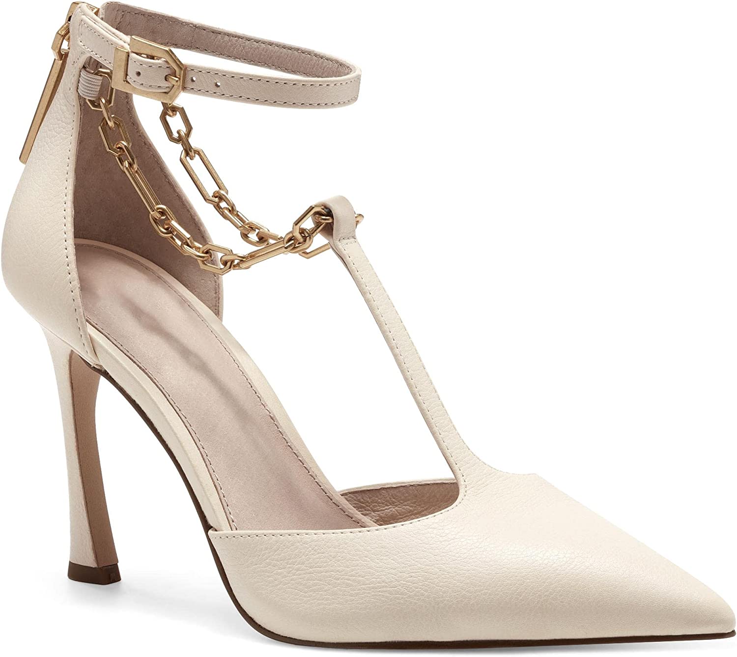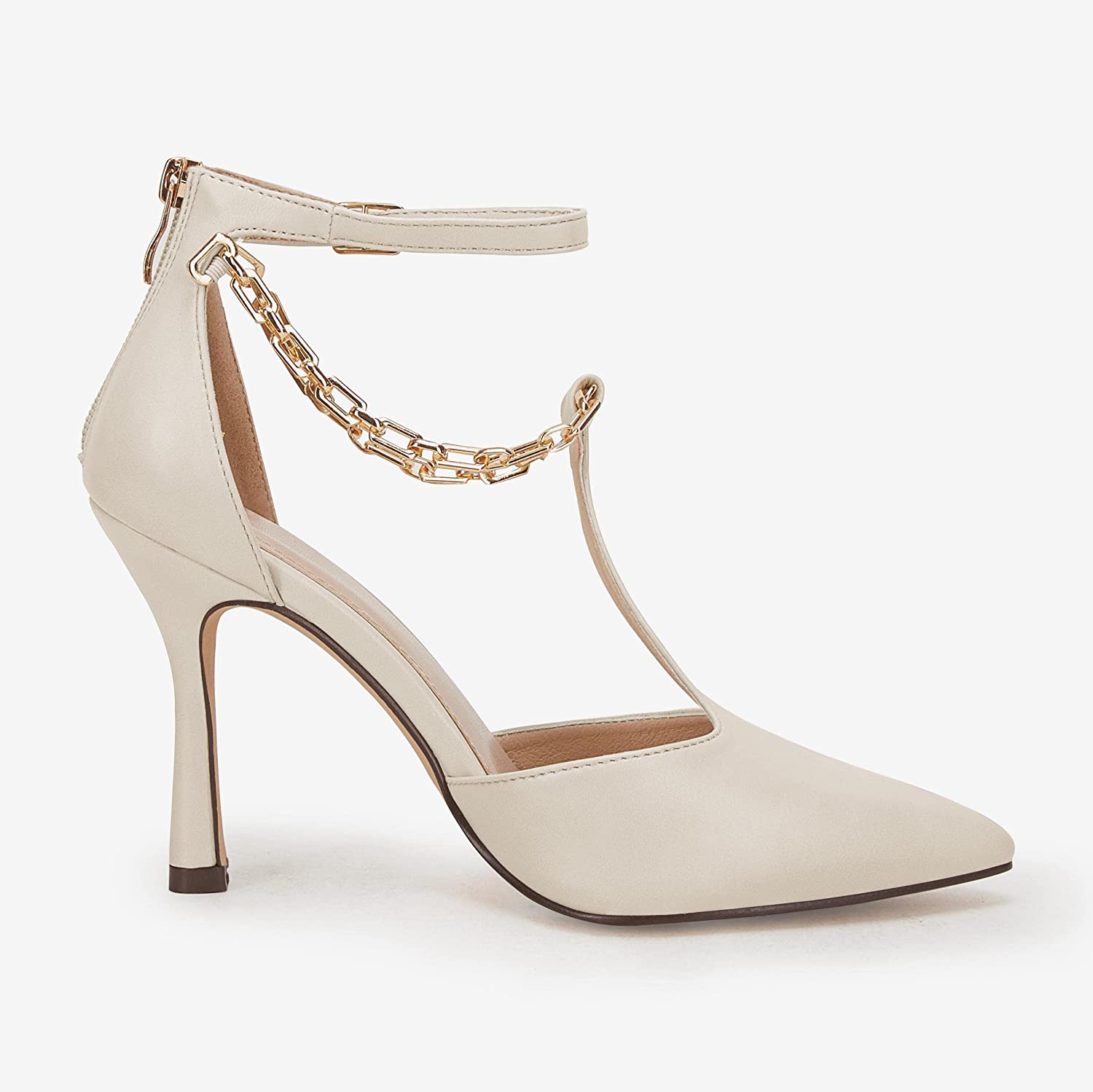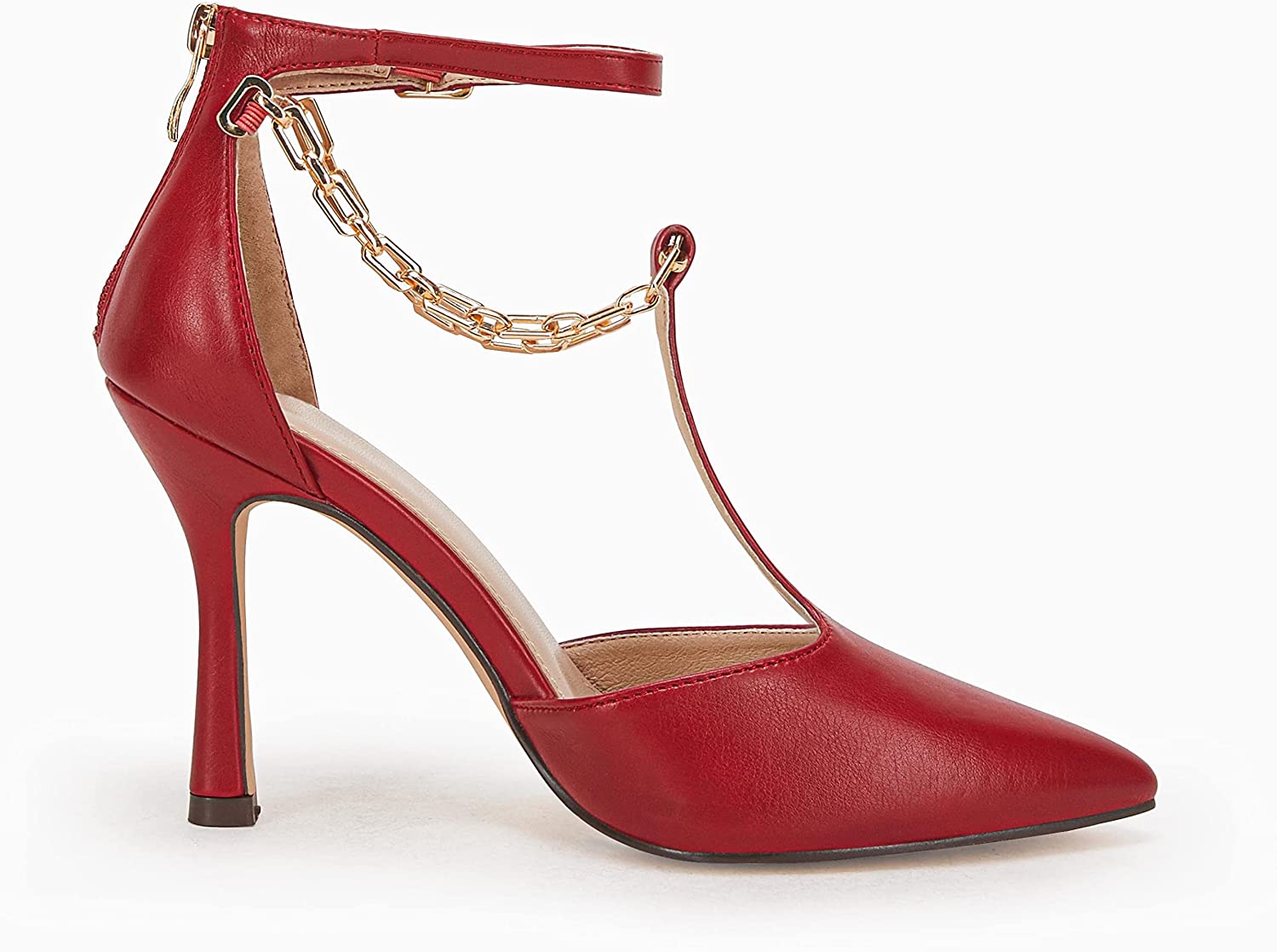 PiePieBuy Womens Ankle Strap Pumps Closed Pointed Toe T-Strap Chain Back Zipper Stiletto Heel Dress Shoes