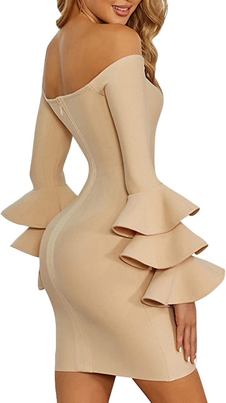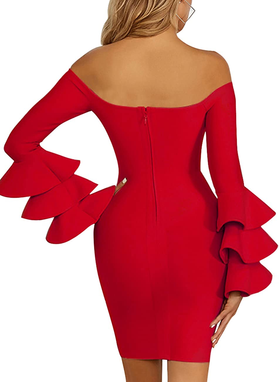 • Features:This bandage dress features stylish ruffle flared long sleeve,off shoulder with anti-slip strip,hidden zipper closure,bodycon tight fit,flattering knee length cut